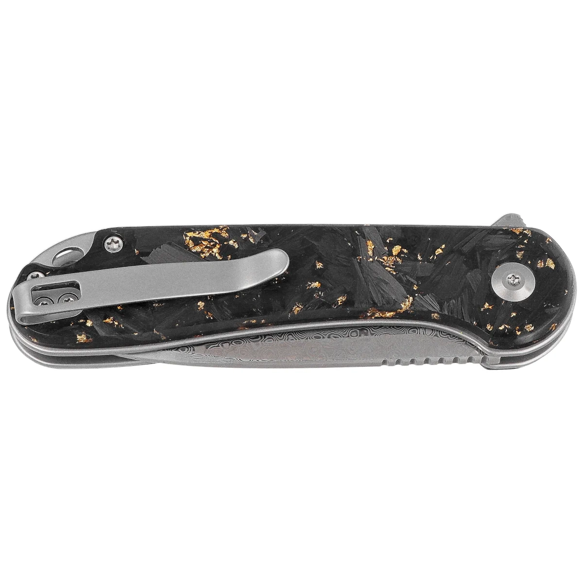 Rękojeść - to okładziny o niepowtarzalnym wzorze 3D. Wykonane ze kawałków rozdrobnionego włókna węglowego (Carbon Fiber) i płatków złota zatopionych w przezroczystej żywicy. Całość mocowana do linersów ze stali nierdzewnej. Prosta, solidna konstrukcja daje pewność wieloletniego użytkowania. Otwarta konstrukcja tzw. open-backed mocowana stalowymi tulejami dystansowymi redukuję wagę oraz ułatwia czyszczenie. Oś pivota zdobi stylizowane logo marki Civivi. Metalowy jednostronny (prawa) klips deep carry pozwala przenosić dyskretnie nóż w kieszeni w pozycji tip-up (czubkiem ostrza do góry).