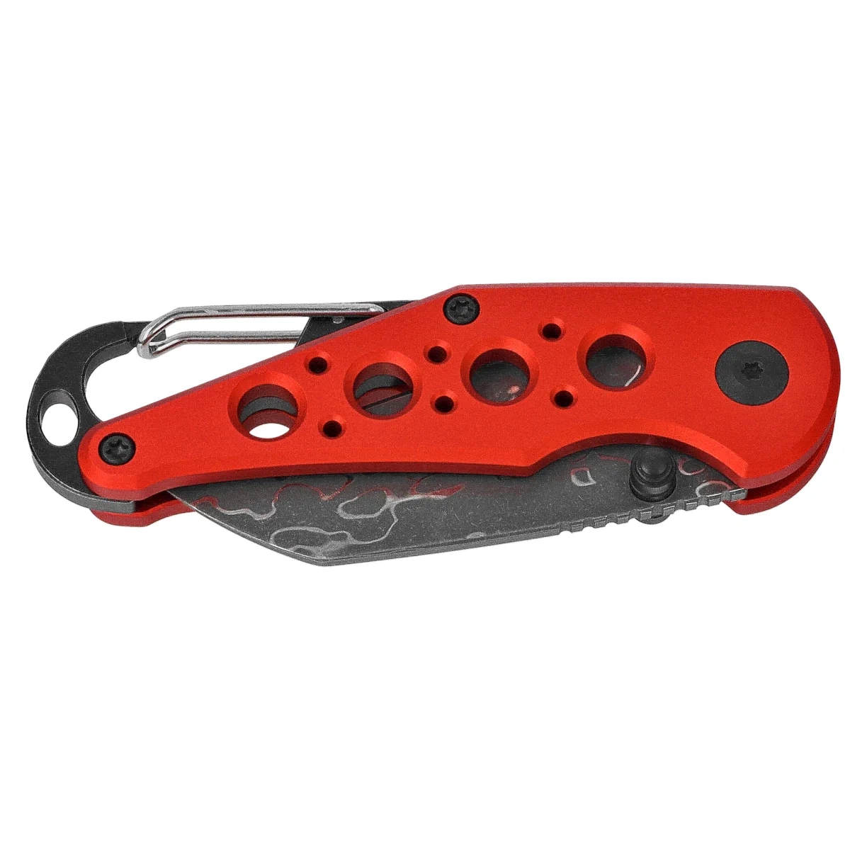 • Pragma Red Aluminium, Damascus, kompaktowy nóż składany EDC, wyposażony w karabińczyk dla łatwiejszego przenoszenia. Służy on również jako otwieracz do butelek. Głownia ze stali Damascus, ergonomiczna, aluminiowa rękojeść.