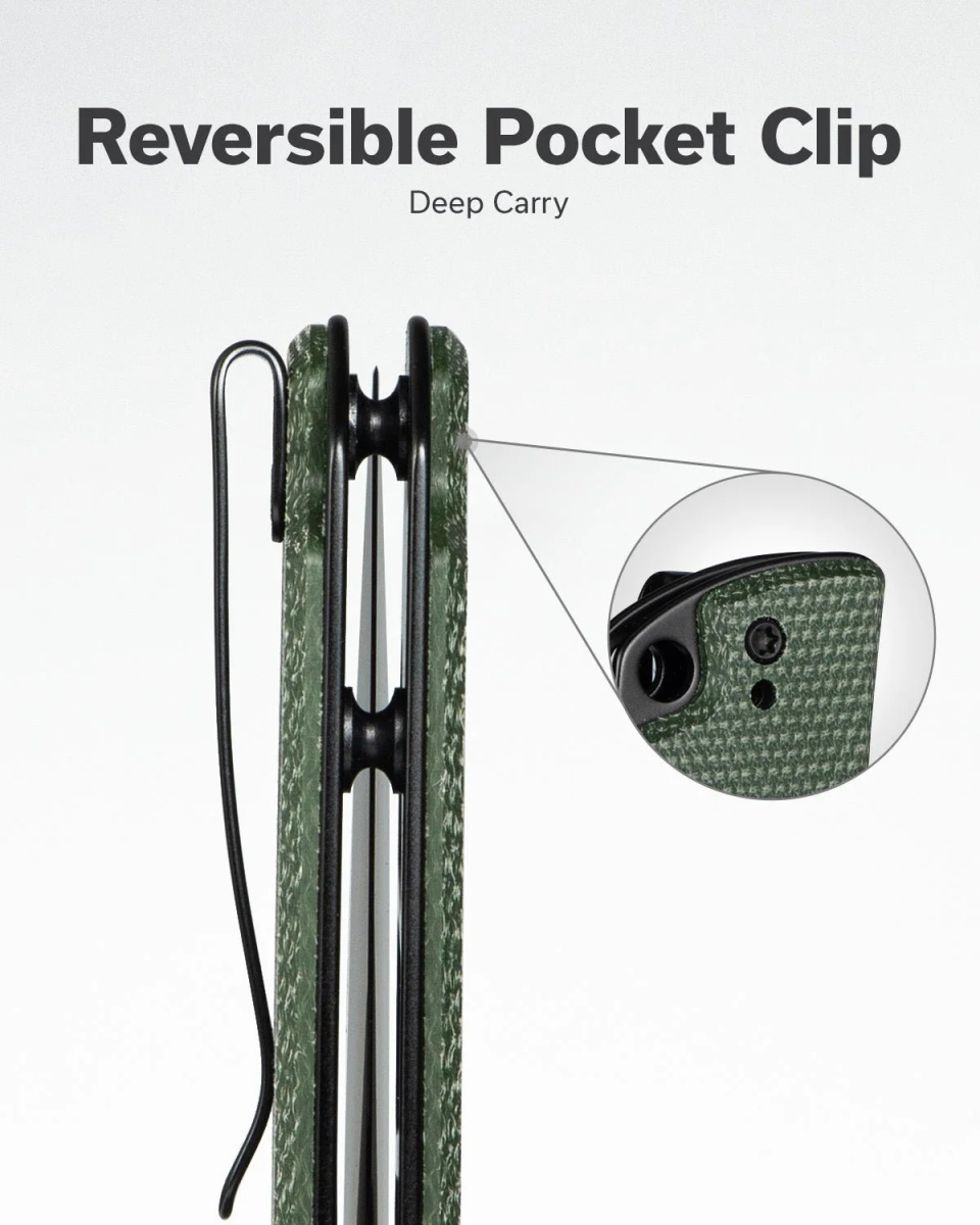 Rękojeść - wykonana z Canvas Micarty, kompozytu płótna i żywicy syntetycznej, tworzywa praktycznie niewrażliwego na warunki atmosferyczne, wysoką i niską temperaturę. Fazowane krawędzie okładek eliminują ostre krawędzie dla wygody, a wykonane z przodu podcięcie na palec (fore finger groove) poprawia pewność uchwytu. Otwarta konstrukcja tzw. open-backed mocowana stalowymi tulejami dystansowymi redukuję wagę oraz ułatwia czyszczenie. Dwupozycyjny, prawo/lewostronny klips deep carry pozwala przenosić dyskretnie nóż w kieszeni w pozycji tip-up (czubkiem ostrza do góry).