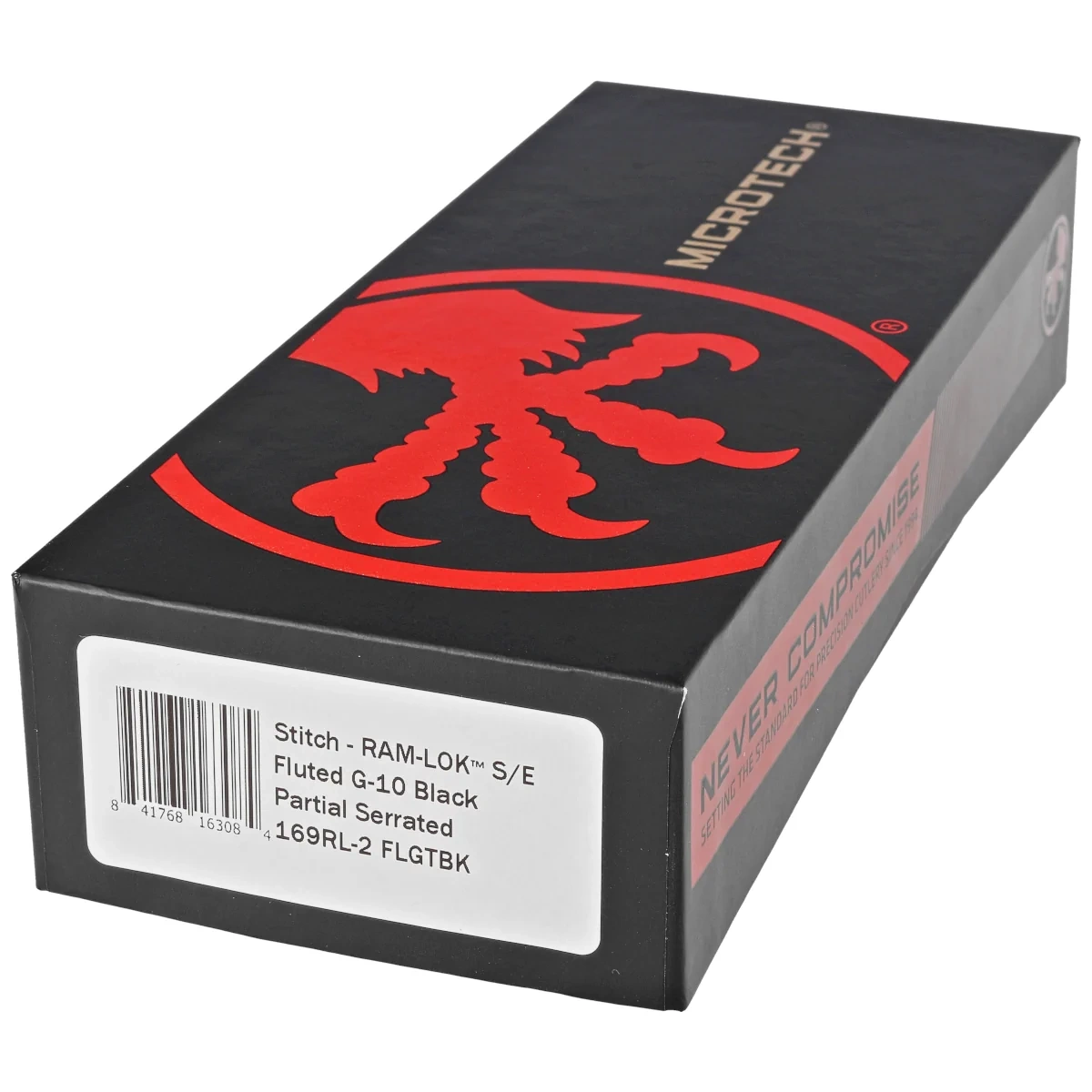 - Stitch Ram-Lok S/E Black Fluted G10, Black P/S manualna wersja popularnego projektu Sebastijana Berenjiego z Borka Blades i firmy Microtech. Szerokie ostrze w kształcie harpuna, doskonałe materiały i legendarna jakość wykonania firmy Microtech Knives.