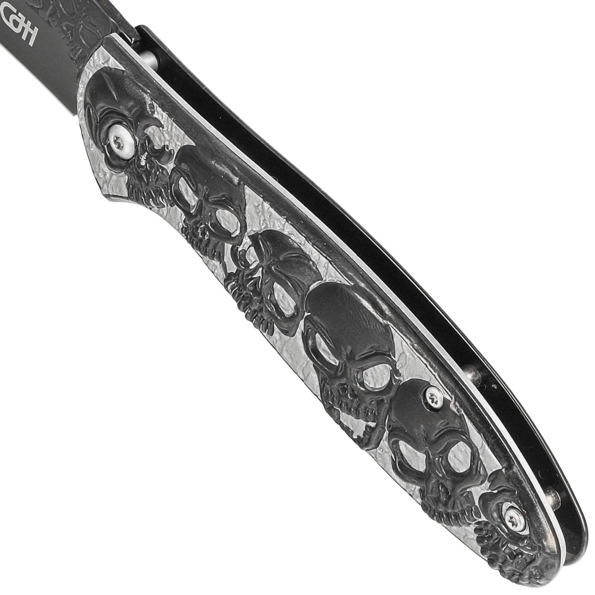 - Skulls Stainless Steel, Titanium Coated, kompaktowy nóż składany renomowanej firmy CJH Herbertz, z motywem czaszek na rękojeści i klindze. Głownia typu drop point wykonana ze stali 420, zapewnia, że nóż wykona każdą pracę jaką przed nim postawisz!