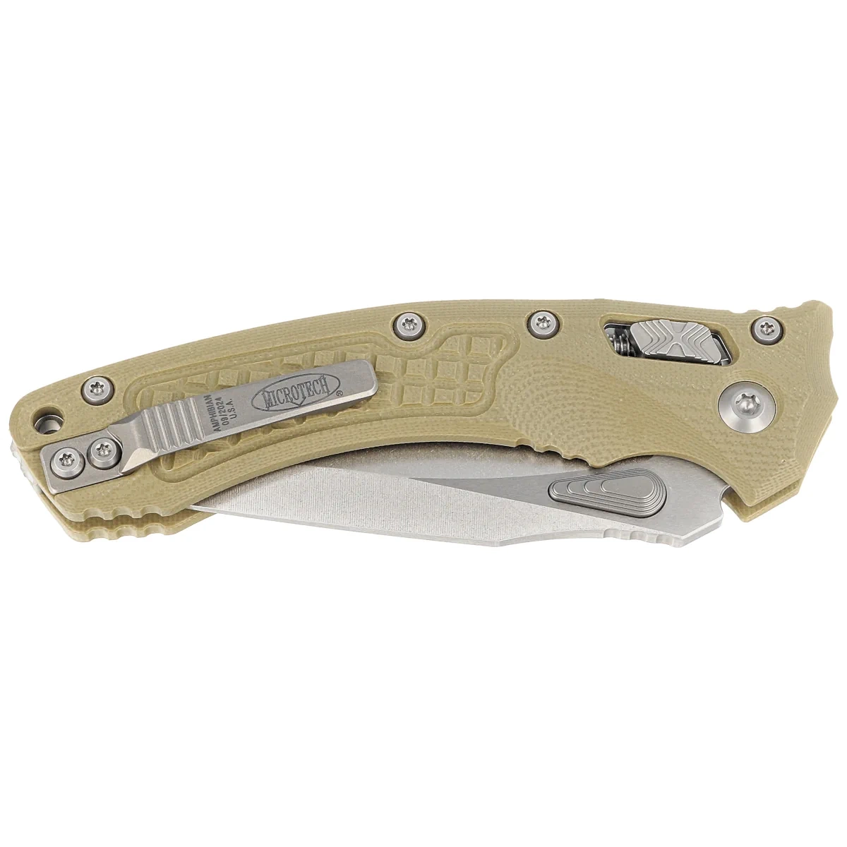 Rękojeść - wykonana z wytrzymałego kompozytu G10. Charakterystyczna faktura rękojeści imitująca powierzchnie granatu odłamkowego (Frag Pattern) oprócz walorów wizualnych powoduje, że nóż nie ślizga się w dłoni podczas używania. Szeroki suwak blokady z charakterystyczną dla firmy Microtech schodkową strukturą X. Obie okładziny zostały skręcone przy pomocy solidnego, backspacera. Dwustronny (prawa / lewa) tytanowy klips pozwala dyskretnie nosić nóż w pozycji tip-up. Nad klipsem lanyard hole, miejsce na linkę zabezpieczającą lub ozdobną.