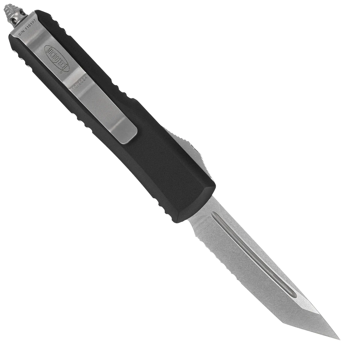 Rękojeść - wykonana z doskonałą precyzją w technologii 3D na frezarkach CNC, z pokrytego twardą powłoką Mil-Spec aluminium 6061-T6. Faktura powierzchni rękojeści powoduje, że nóż nie ślizga się w dłoni podczas używania. Na grzbiecie i dole rękojeści znajdują się nacięcia (jimping) dla pewniejszego chwytu. Smukły profil oraz frezowany dwupozycyjny (prawa/lewa) masywny klips typu deep carry, umożliwiają dyskretne przenoszenie noża w kieszeni, w pozycji tip-down (czubkiem ostrza do dołu). Na klipsie znajduje się logo Microtech, numer seryjny i data produkcji. Rękojeść zakończono zbijakiem do bicia szyb, masywny stalowy trójkąt, w który wprasowano kulkę z węglika wolframu. Znajduję się w nim również otwór do przeplecenia linki ozdobnej.