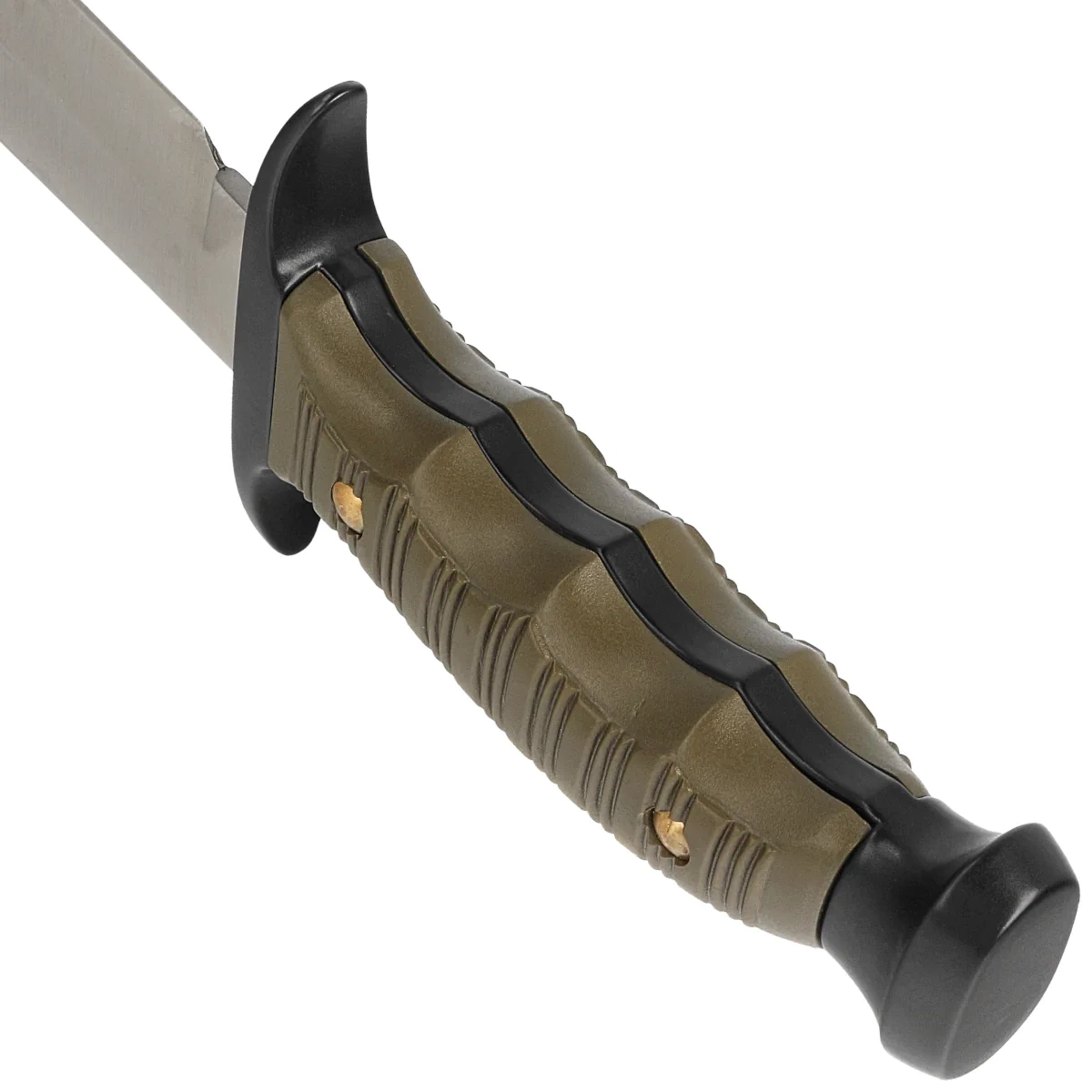Głownia - szeroka i mocna o profilu Bowie wykończona eleganckim Satynowaniem. Mimo grubości, szlif wklęsły zapewnia doskonałe właściwości tnące połączone ze znakomitą wytrzymałością. Długie fałszywe ostrze zwiększa właściwości przebijające. Obustronna garda wykonana ze stopu cynku i aluminium, zabezpiecza palce przed ześlizgnięciem się na ostrze podczas pracy.