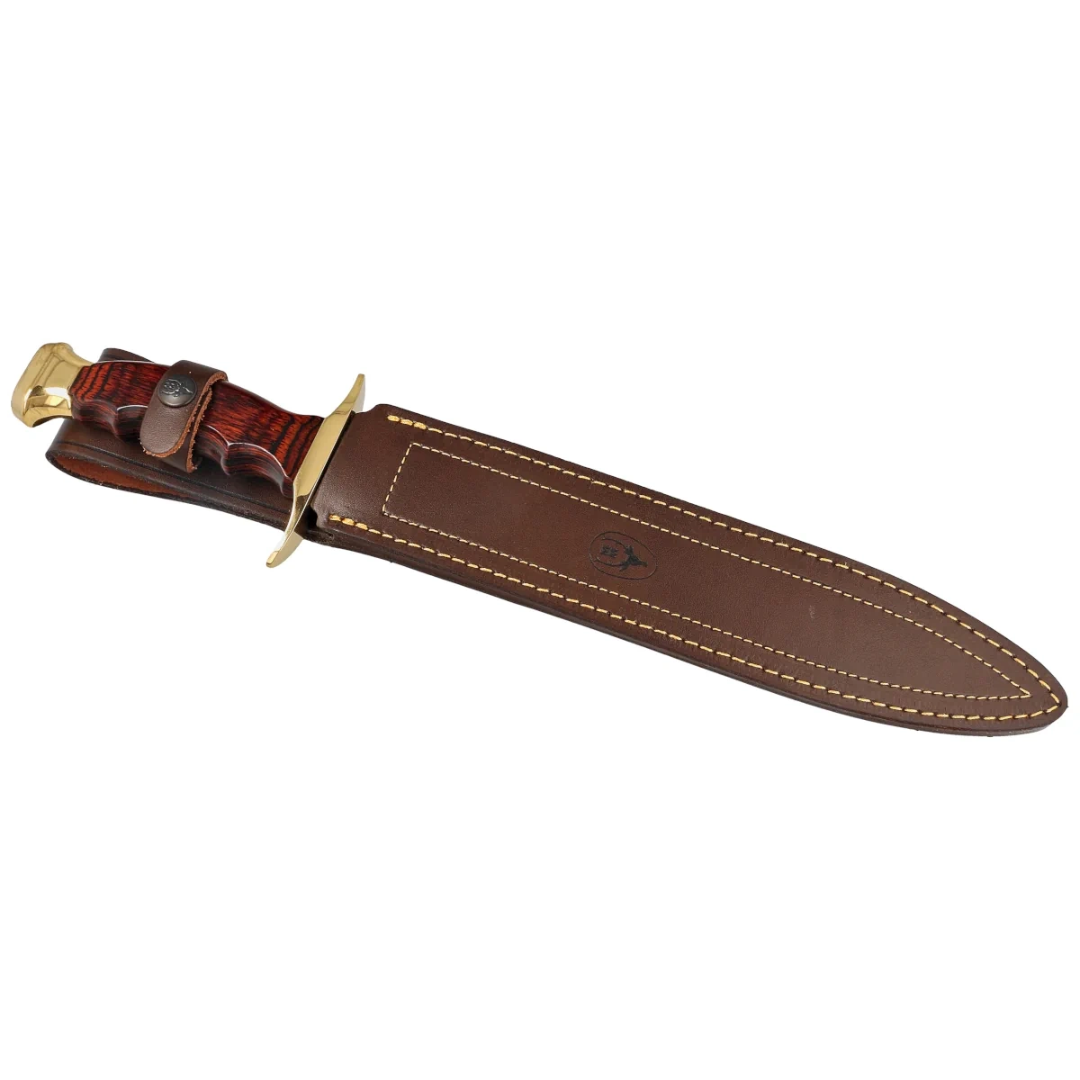 • BW-26 nóż ze stałą klingą ze stali molibdenowo-wanadowej MoVa przeznaczony do wszelakich prac w terenie. Okładziny o niepowtarzalnym wzorze z drewna syntetycznego coral pakka wood zakończone mosiężnymi głowicami. Ręcznie szyta skórzana pochwa.