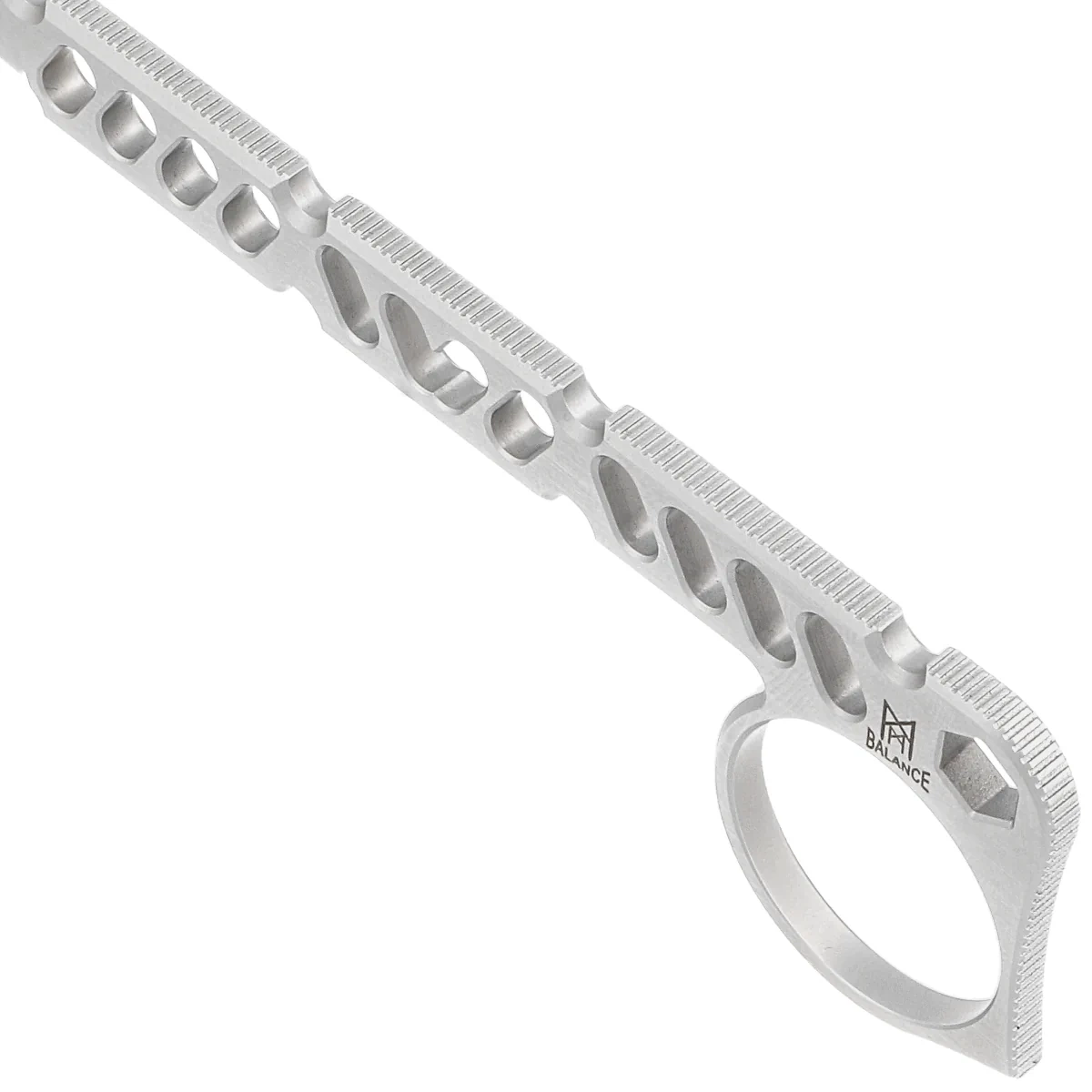 Rękojeść - tang noża z serią otworów zmniejszających wagę i polepszających uchwyt. W górnej i dolnej części znajdziemy karbowany (jimping) fragment polepszający kontrolę nad nożem. Prosta, solidna konstrukcja daje gwarancję wieloletniego użytkowania. Pierścień palcowy back ring / tail ring / ring pommel zapobiegają wyślizgiwaniu się noża podczas pracy a także pozwalają na wykonywanie prostych prac manualnych bez odkładania noża.