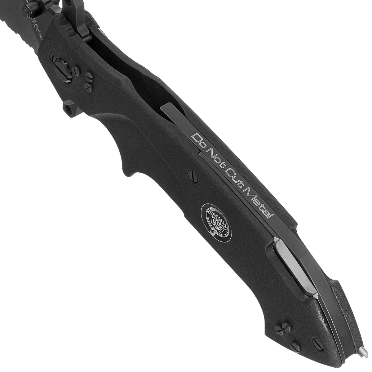 Głownia - masywna z obusiecznym zmodyfikowanym kształtem Tanto, zapewnia ponadprzeciętne właściwości tnące i penetrujące. Klingę pokryto czarną, polerowaną chemicznie, nierefleksyjną powłoką MIL-C-13924 BURNISHING. Ostrze częściowo ząbkowane Combo wyprowadzono szlifem płaskim pełnym (Full Flat grind) który zapewnia wytrzymałość, doskonałą geometrię krawędzi tnącej oraz ekstremalną wydajność cięć materiałów tekstylnych, twardych tworzyw sztucznych, włóknistych. Podwójny system blokady głowni: solidny mechanizm Liner-Lock wspomagany przez dodatkową blokadę. Stalowy obustronny jelec po złożeniu klingi działający jak Flipper lub jak hak Emerson uzupełniono o kołek Thumb Stud tworząc potrójny system szybkiego otwarcia noża.