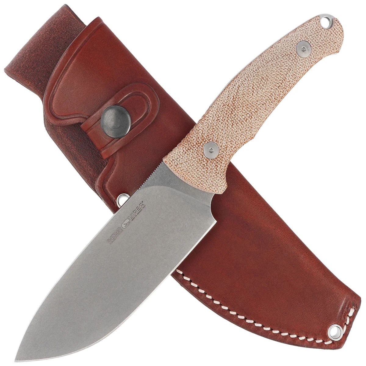 • Ranger Natural Canvas Micarta, Stonewashed projektu Jensa Ansø. Solidny kawałek sprawdzonej stali nierdzewnej N690, wielofunkcyjny nóż włoskiej marki Viper. Wygodna rękojeść z kompozytu Micarta, pochwa z wysokojakościowej skóry z mocowaniem do pasa.