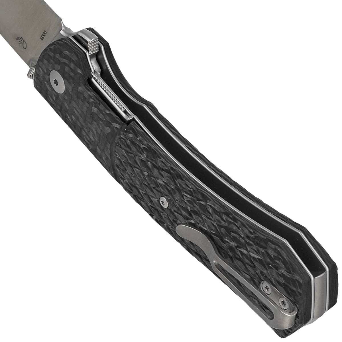 Rękojeść - z kompozytu Carbon Fiber, praktycznie niezniszczalnego tworzywa, niewrażliwego na warunki atmosferyczne, odpornego na chemikalia i uszkodzenia mechaniczne. W tylnej części frezowana faktura 3D poprawiająca pewność chwytu. Okładziny przykręcono do frezowanego obrabiarkami CNC tytanowego backspacera, co zapewnia pożądaną sztywność takiej konstrukcji. Fazowanie okładek eliminuje ostre krawędzie dla wygody, a wykonane z przodu podcięcie na palec (fore finger groove) poprawia pewność uchwytu. Prawostronny, jednopozycyjny głęboki klips z tytanu pozwala przenosić dyskretnie nóż w pozycji tip-up (czubkiem do góry).