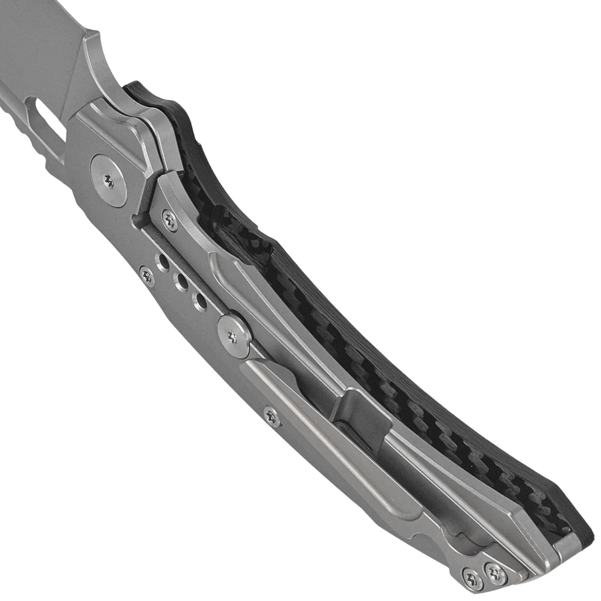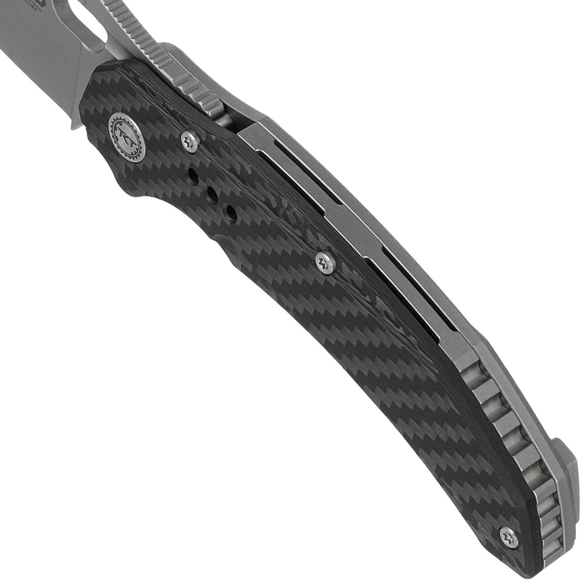 Rękojeść - po stronie prezentacyjnej kompozyt Carbon Fiber, praktycznie niezniszczalne tworzywo niewrażliwe na warunki atmosferyczne, odporne na chemikalia i uszkodzenia mechaniczne. Strona blokady to lity tytan 6AL4V. Fazowane krawędzie okładek eliminują ostre ranty dla wygody i poprawiają pewność uchwytu. Masywny tytanowy backspacer do którego przymocowano okładziny gwarantuje sztywność i wytrzymałość całej konstrukcji. Oś piwota ozdobiona logiem projektantów, Todd Knife and Tool. Jednopozycyjny, prawostronny tytanowy klips umożliwia przenoszenie noża w pozycji tip-up, czubkiem ostrza ku górze.