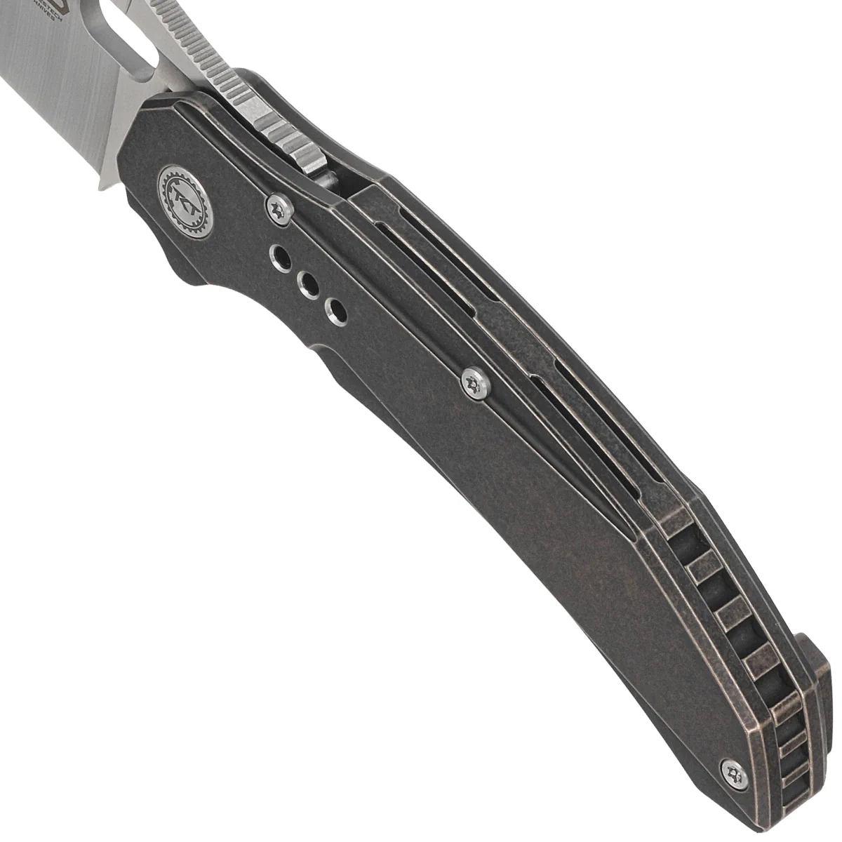 Głownia - szeroka, typu Spear Point z eleganckim wykończeniem metodą Satin. Wydatny brzusiec wydłuża długość krawędzi tnącej w stosunku do długości klingi zbiegając się w kierunku ostrego jak igła czubka noża. Grubość klingi zapewnia wysoką wytrzymałość podczas gdy wysoki, płaski szlif daje doskonałą geometrię krawędzi tnącej oraz ekstremalną wydajność cięcia. Dodatkowym wzmocnieniem jest długie zbrocze. Ceramiczne łożyska kulkowe wspomagają otwarcie ostrza za pomocą szybkiej płetwy front flippera (index-finger front flipper). Nóź możemy również otworzyć przy użyciu otworu w klindze (thumb hole). Całość blokowana jest sprawdzoną i popularną blokadą frame lock ze stalową wkładką zabezpieczającą przed wycieraniem czoła blokady.