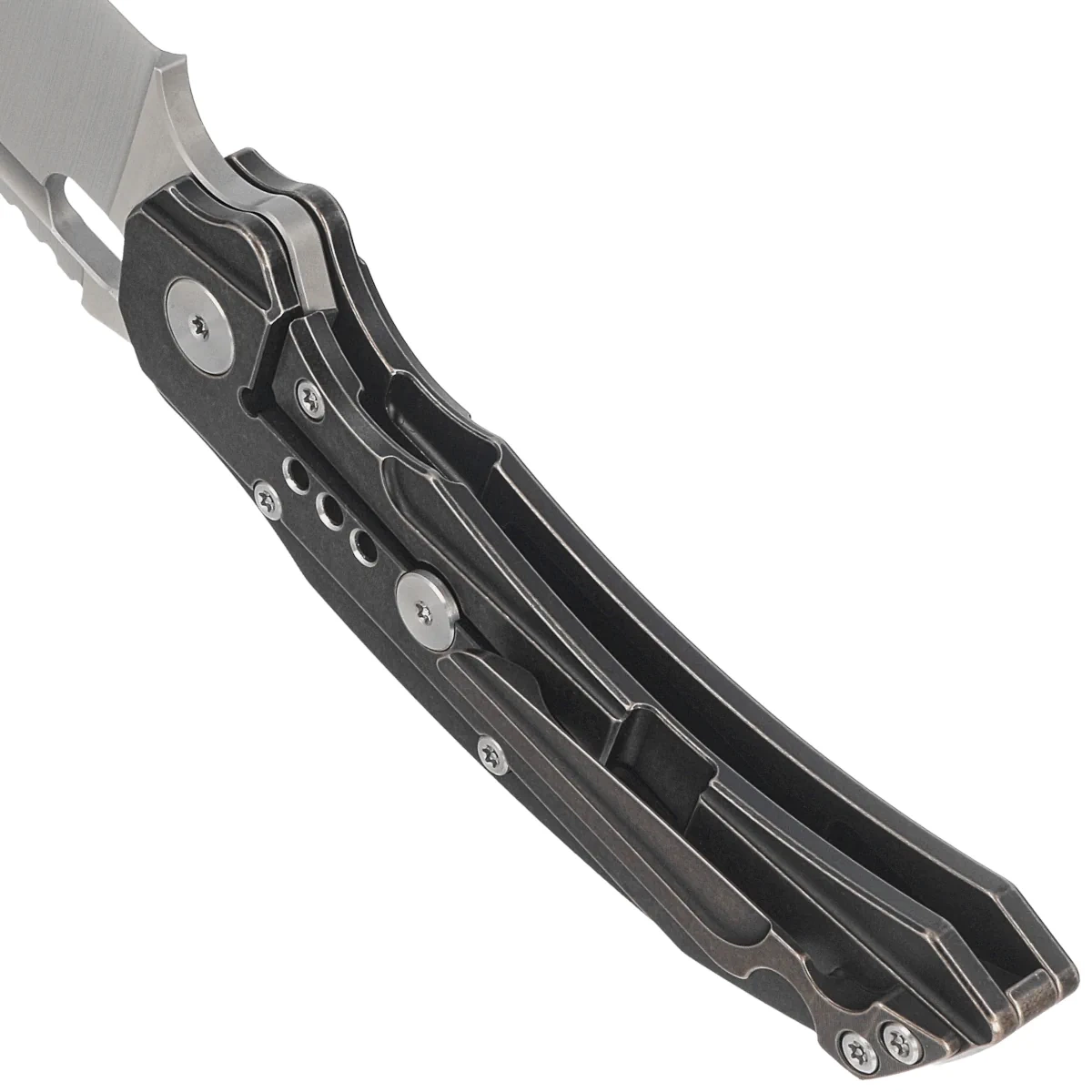 Rękojeść - to dwa kawałki litego tytanu 6AL4V. Fazowane krawędzie okładek eliminują ostre ranty dla wygody i poprawiają pewność uchwytu. Masywny tytanowy backspacer do którego przymocowano okładziny gwarantuje sztywność i wytrzymałość całej konstrukcji. Oś piwota ozdobiona logiem projektantów, Todd Knife and Tool. Jednopozycyjny, prawostronny tytanowy klips umożliwia przenoszenie noża w pozycji tip-up, czubkiem ostrza ku górze.
