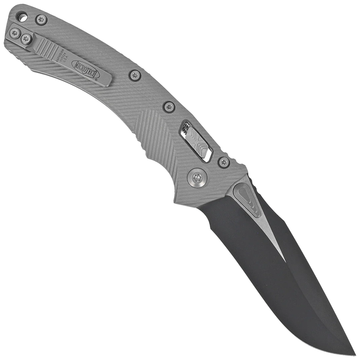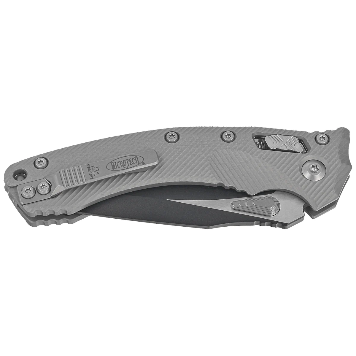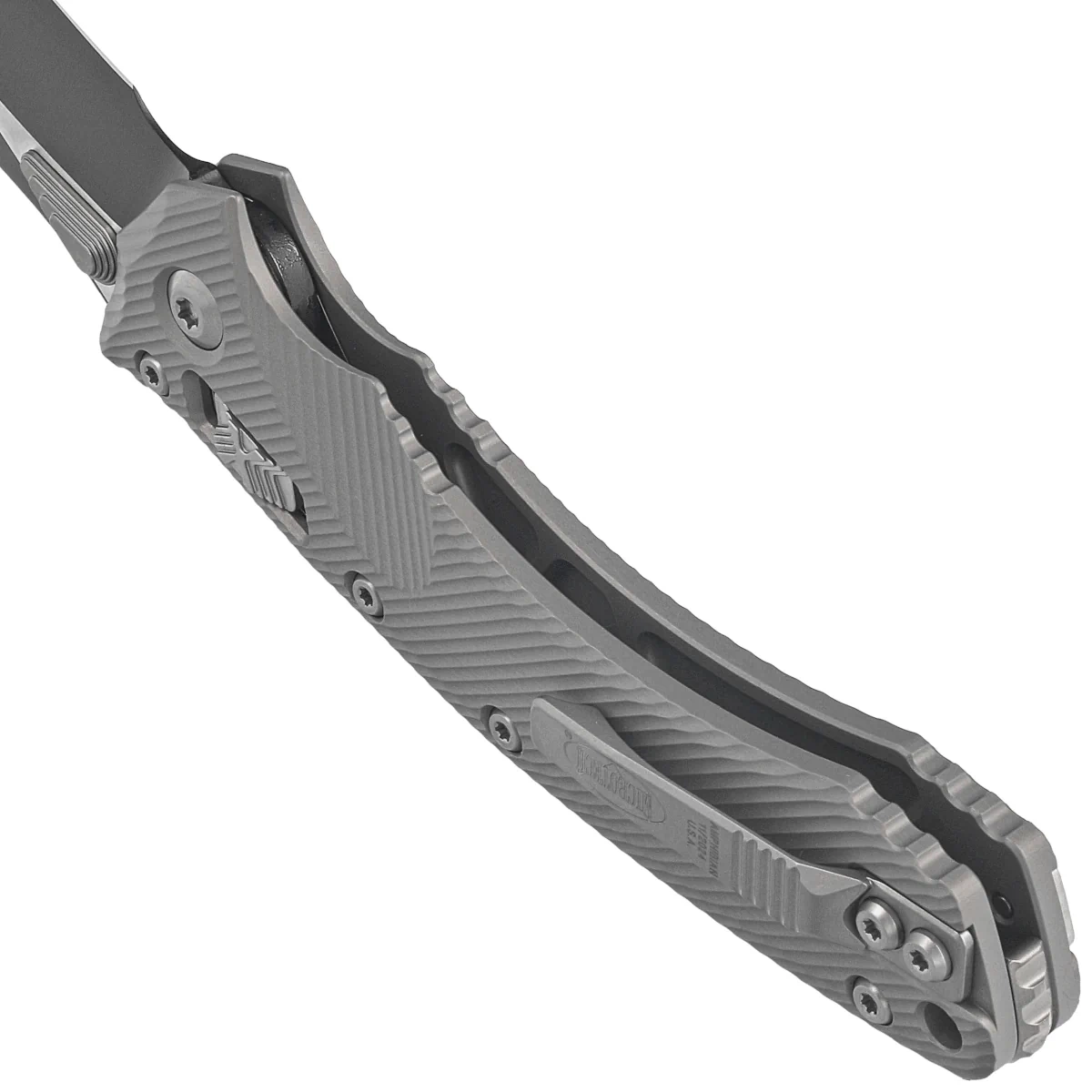 Rękojeść - wykonana z doskonałą precyzją w technologii 3D na frezarkach CNC, ze szczotkowanego i polerowanego aluminium 6061-T6, dla lepszego uchwytu pokryta wyfrezowanymi liniami (Fluted). Szeroki suwak blokady z charakterystyczną dla firmy Microtech schodkową strukturą X. Obie okładziny zostały skręcone przy pomocy solidnego, backspacera. Dwustronny (prawa / lewa) tytanowy klips pozwala dyskretnie nosić nóż w pozycji tip-up. Nad klipsem lanyard hole, miejsce na linkę zabezpieczającą lub ozdobną.