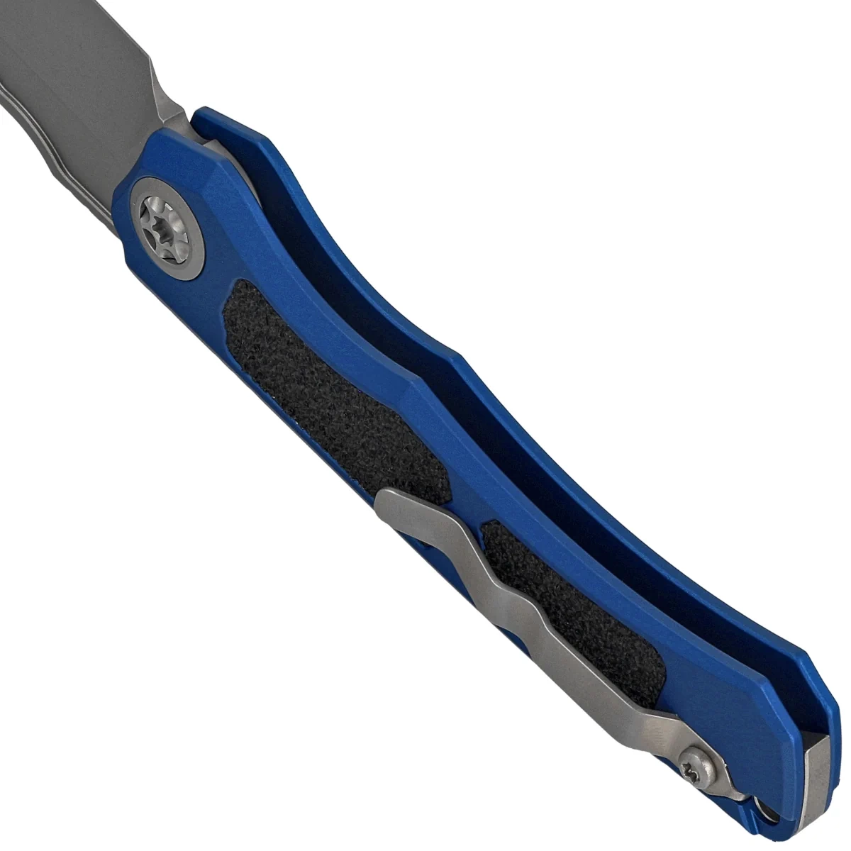 Rękojeść - precyzyjnie wykonana na frezarkach CNC z aluminium 6061-T6 z idealnie dopasowaną wkładką Black Traction Tape o fakturze papieru ściernego dzięki czemu nóż nie ślizga się w dłoni podczas użytkowania. Na krawędziach rękojeści znajdują się nacięcia (jimping) poprawiające uchwyt. Oś pivota ozdobiona designerską śrubą. Frezowany, dwupozycyjny (prawa/lewa) tytanowy klips typu deep carry pozwala przenosić nóż w pozycji tip-up. Nad klipsem lanyard hole, otwór do przewleczenia linki zabezpieczającej.