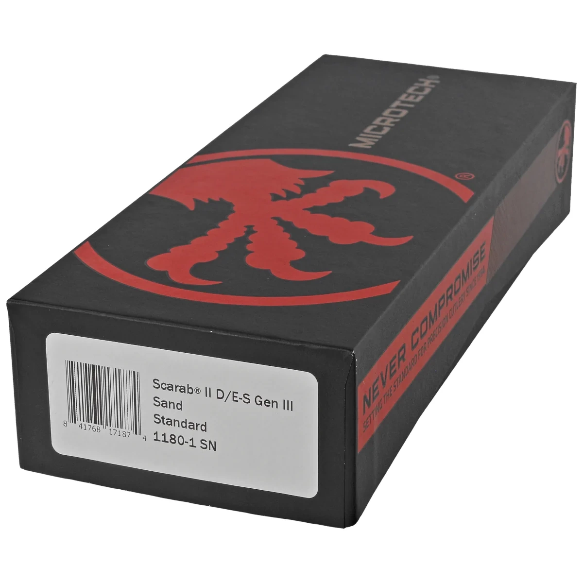 Scarab II Gen III D/E-S Sand Aluminium/3M, Black to szczyt doskonałości w dziedzinie automatycznych noży taktycznych, czerpiący inspirację z oryginalnego projektu Microtech Ultratech. Zbudowany, aby wytrzymać najtrudniejsze warunki, nowy Scarab II jest najlepszym wyborem do intensywnego użytkowania. Zachowując cechy stylistyczne swojego poprzednika, wyznacza nowy standard dla technologii OTF (Out The Front).