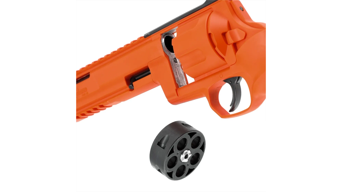Inteligentne zasilanie CO2. Rewolwer zasilany jest standardową kapsułą CO2 12 g, montowaną w rękojeści. W przeciwieństwie do klasycznych replik pneumatycznych, kapsułę można przenosić przez długi czas bez aktywacji. Wystarczy uderzyć w wystające pokrętło, aby błyskawicznie przebić kapsułę i natychmiast przygotować broń do strzału. Dzięki temu użytkownik ma pewność, że w sytuacji zagrożenia rewolwer będzie gotowy do działania z pełną mocą.