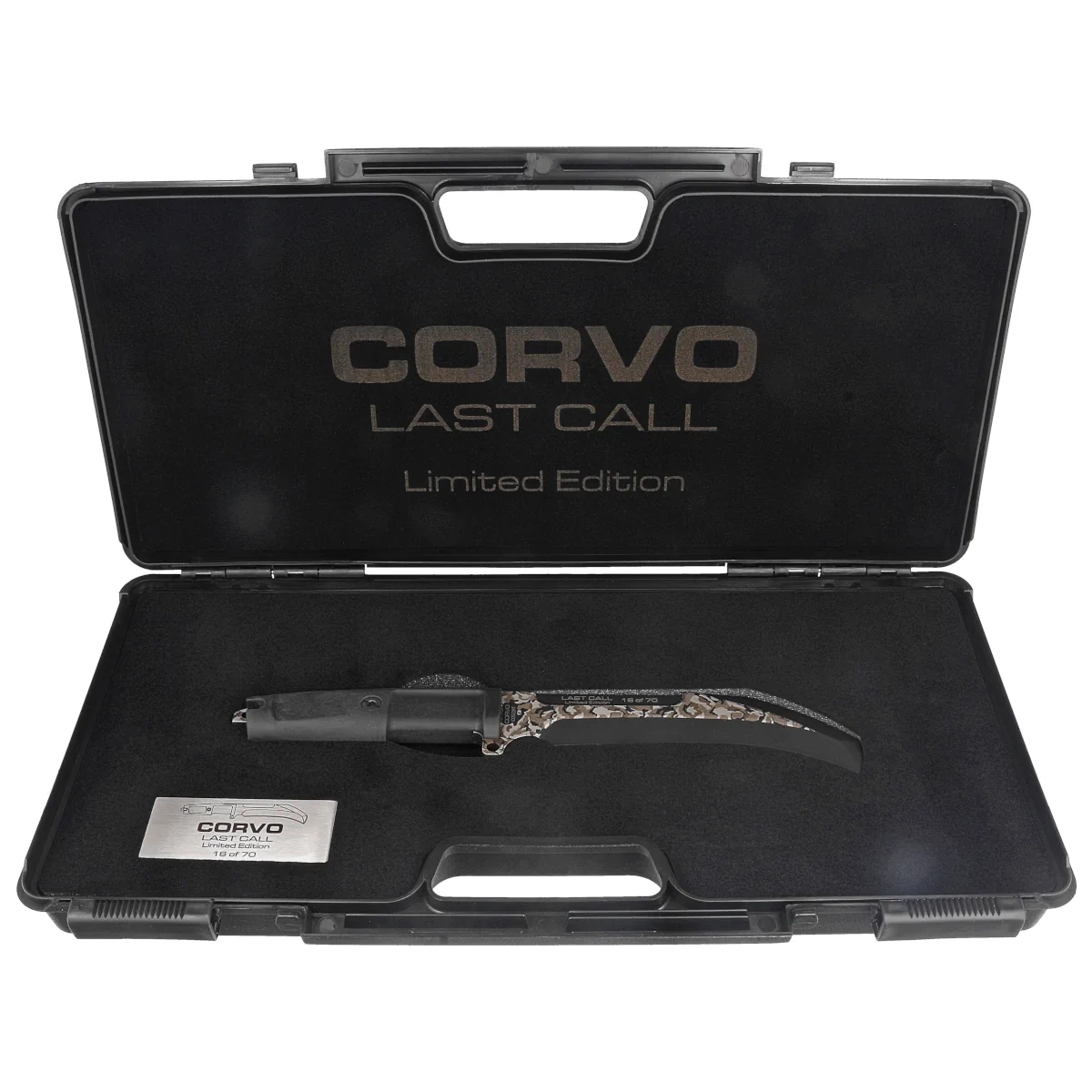 Corvo Last Call LE No 016/70 Black Forprene, Black MIL-C/Geotech Camo, limitowana do 70 sztuk wersja noża armii chilijskiej, używanego m.in. przez siły specjalne. Chilijski szpon śmierci Corvo, udowodnił swoją skuteczność od bitew południowoamerykańskich aż po piaski Iraku. Combat knife z długim zakrzywionym ostrzem, zwężającym się do ostrego punktu dzięki swojej wadze i wyważeniu znakomicie spisuje się podczas aktywności outdoorowej oraz do obrony. Sztych do wbijania i grzebania, ostrze do siekania oraz do strugania.