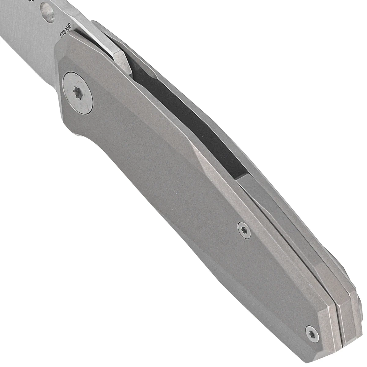 Rękojeść - lity tytan 6AL4V, piaskowany dla lepszego chwytu. Fazowane krawędzie okładek eliminują ostre ranty dla wygody i poprawiają pewność uchwytu. Połączone ze sobą masywnym tytanowym backspacerem zapewniającym sztywność całej konstrukcji. Prostota i solidność budowy dają pewność wieloletniego użytkowania. Klips jednopozycyjny (prawa), wykonany z tytanu, umożliwia przenoszenie noża w pozycji tip-up.