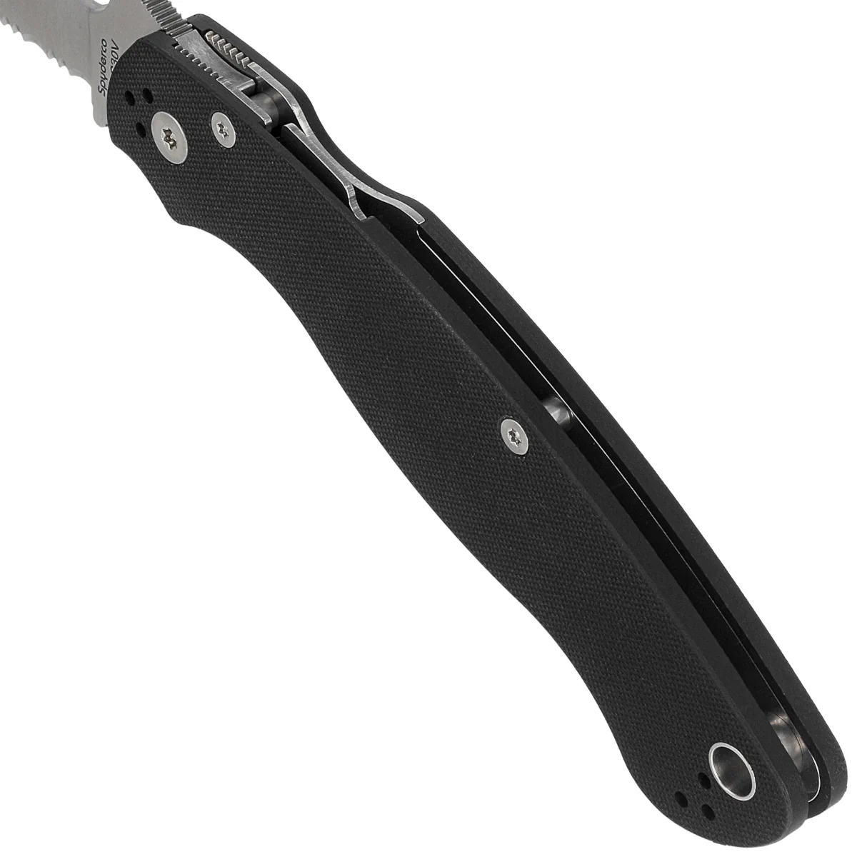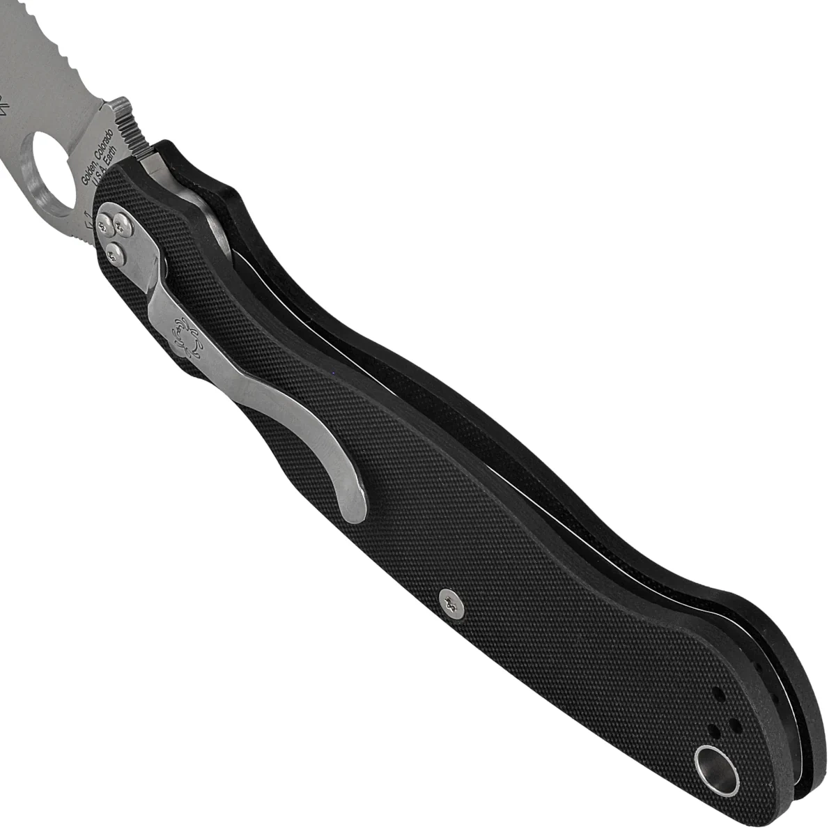 Głownia - zmodyfikowany profil Clip Point z powiększonym 14 mm wycięciem SpyderHole (patent Spyderco) umożliwiający szybkie otwarcie noża również w rękawicy, powiększona rampa pod kciuk z nacięciami (spine jimping), który pomaga kontrolować duże ostrze. Index Finger Choil (karbowane profilowane podcięcie pod palec wskazujący między rękojeścią a krawędzią tnącą), zapobiega przesuwaniu się foldera w dłoni podczas wykonywania mocnych cięć. Ostrze częściowo ząbkowane (P/S) w połączeniu z pełnym, płaskim szlifem (Full Flat Grind) daje doskonałą geometrię krawędzi tnącej oraz ekstremalną wydajność cięcia.