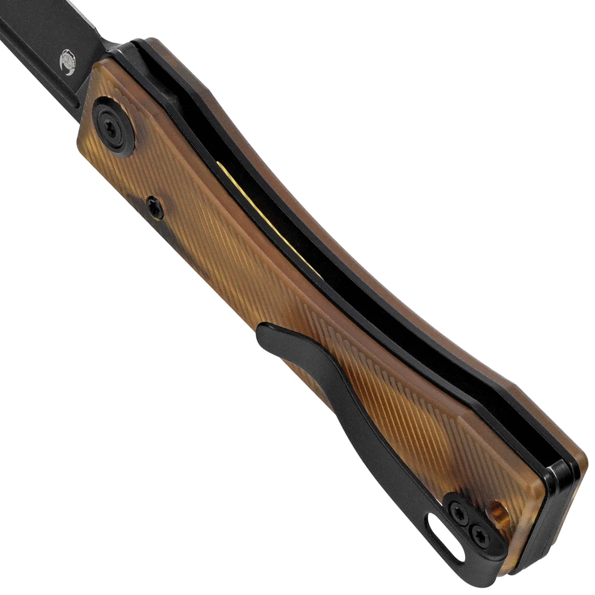 - Akino Yellow Ultem, Blackwashed kompaktowy folder EDC, projekt znanego designera Tiguassa. Użytkowa głownia ze stali Sandvik 14C28N. Prosta, wygodna rękojeść z kompozytu ULTEM. Jedna z najlepiej przetestowanych blokad na świecie, czyli lockback.
