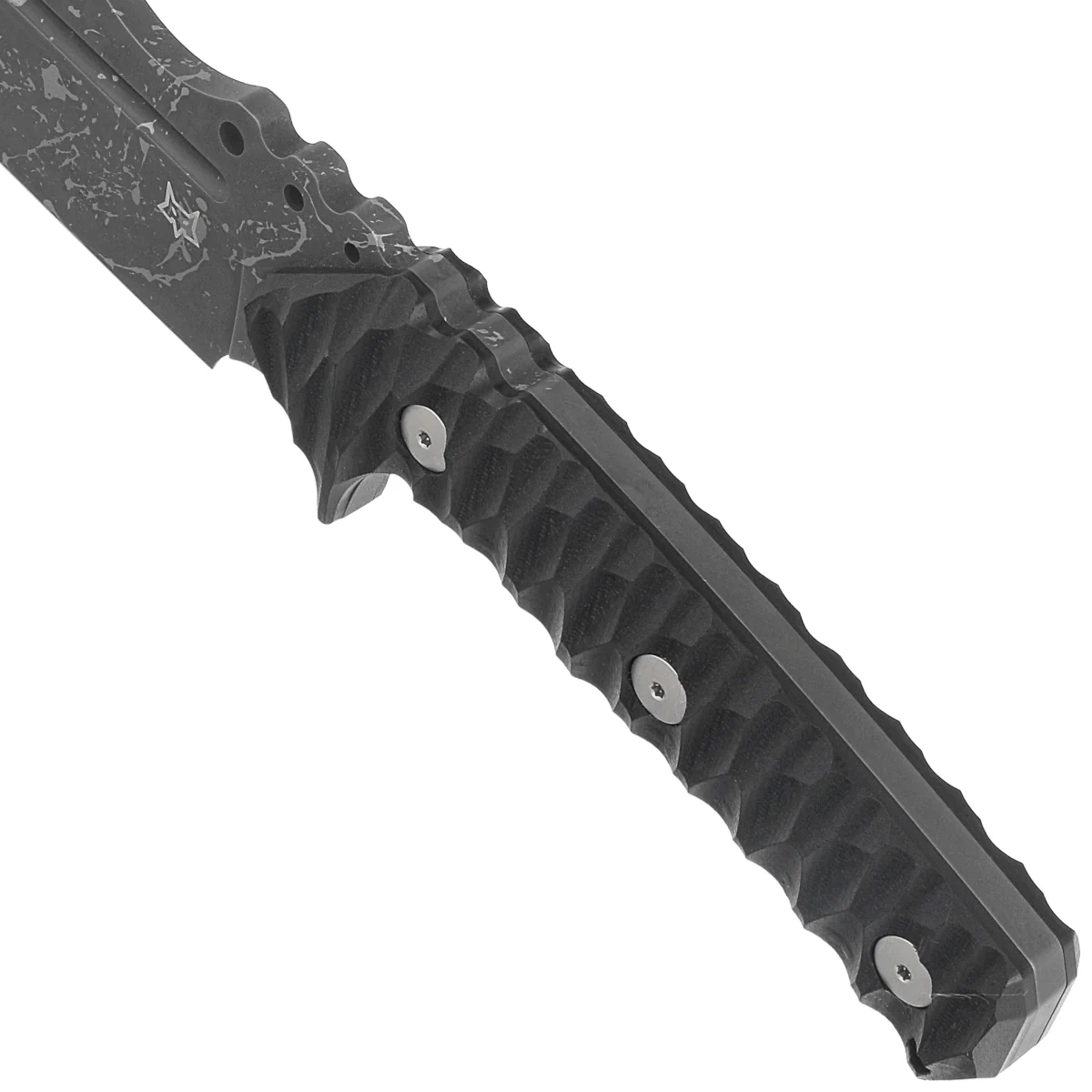 Rękojeść - profilowane okładziny z G10, praktycznie niezniszczalnego tworzywa niewrażliwego na warunki atmosferyczne, odpornego na chemikalia i uszkodzenia mechaniczne. Fazowane krawędzie okładek eliminują ostre ranty a teksturowanie i faktura powierzchni poprawia pewność uchwytu. Okładki chwytu przymocowano do trzpienia śrubami Torx. Nisko schodząca dolna garda oraz Fore Finger Groove, głębokie pocięcie pod palec zapobiegają przypadkowemu ześlizgnięciu się ręki na ostrze.