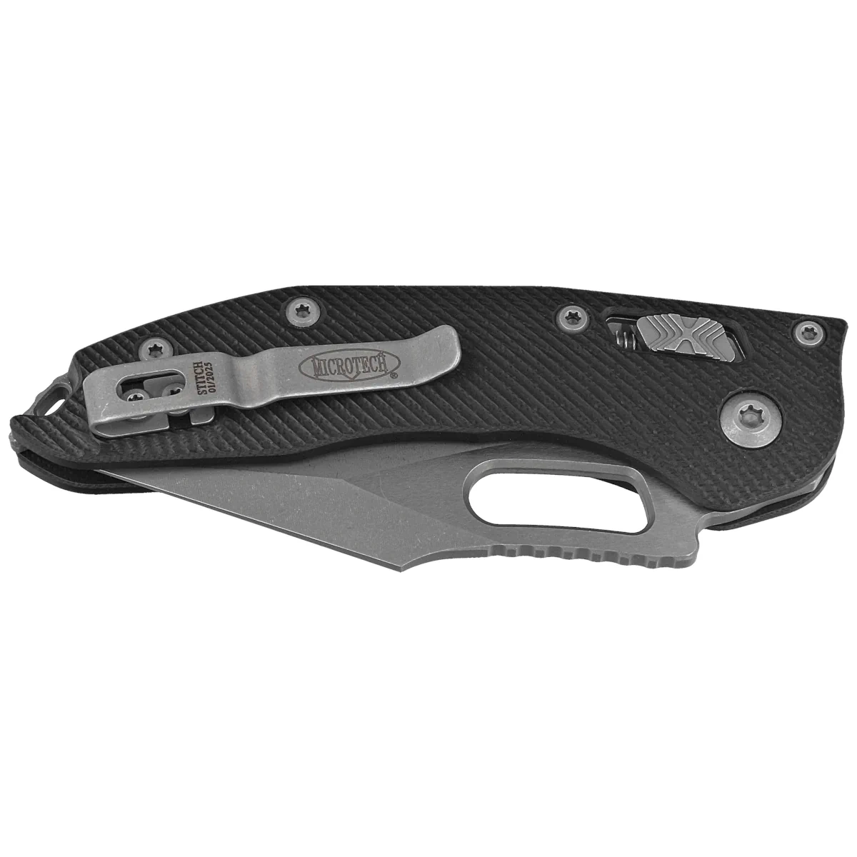 Rękojeść - wykonana na frezarkach CNC z doskonałą precyzją, z kompozytu G10, praktycznie niezniszczalnego tworzywa niewrażliwego na warunki atmosferyczne, odpornego na chemikalia i uszkodzenia mechaniczne, o głęboko frezowanej strukturze 3D Fluted. Szeroki suwak blokady z charakterystyczną dla firmy Microtech schodkową strukturą X. Obie okładziny zostały skręcone przy pomocy solidnego, aluminiowego backspacera. Dwustronny (prawa / lewa) klips pozwala dyskretnie nosić nóż w pozycji tip-up. Wystający fragment backspacera w którym znajduje się otwór na linkę, może również służyć za improwizowany zbijak do szkła.