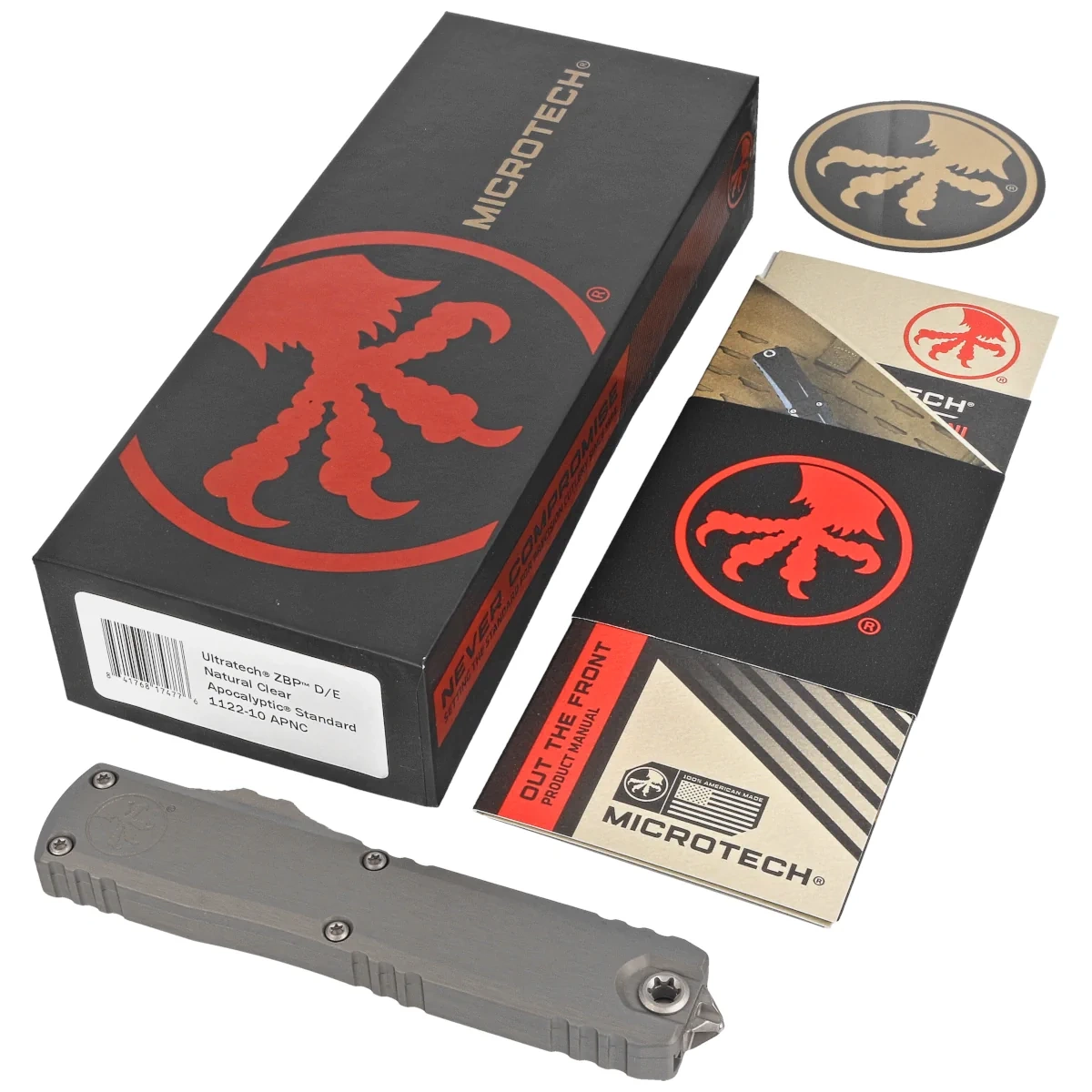 Ultratech Gen III ZBP D/E Natural Clear Aluminium, Apocalyptic to nowa odsłona serii Ultratech - pierwszy nóż OTF firmy Microtech bez jakiegokolwiek luzu ostrza po jego rozłożeniu! Automat z ostrzem "blade play free" wyróżnia się szeregiem usprawnień, takich jak; Crud Kutter™, Dual-Fuel Drive Train™, Zero Blade Play™. Przeprojektowano również rękojeść, wyposażając ją w rozwiązania znane z innych modeli. Pracujący w trybie D/A (Double Action), umożliwia błyskawiczne wysunięcie i schowanie ostrza za pomocą jednego ruchu kciuka. Projekt autorstwa Tony’ego Marfione, właściciela Microtech Knives, łączy w sobie nowoczesny design z najwyższą jakością wykonania