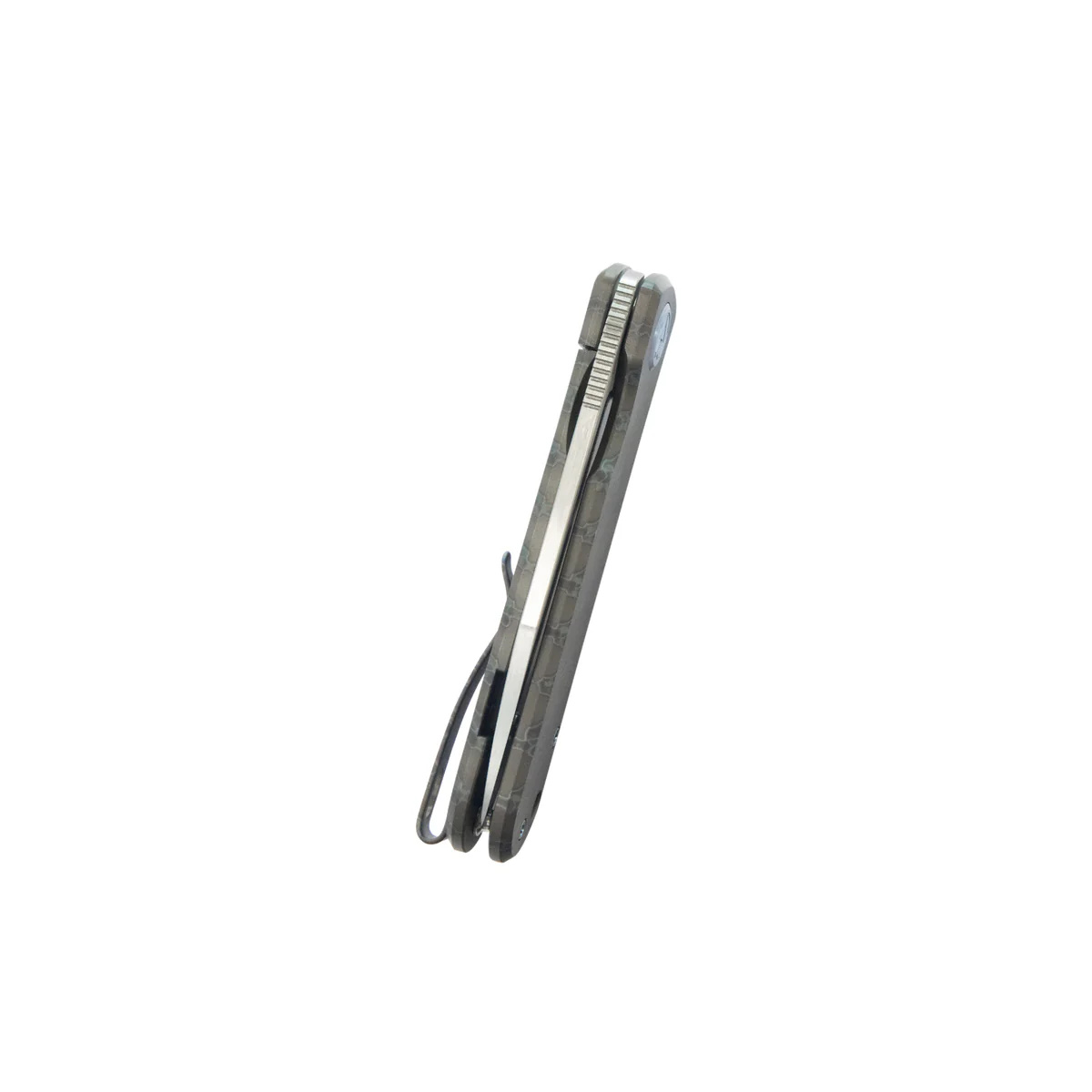Rękojeść - okładziny z tytanu 6AL4V barwionego płomieniowo wzorem Tiger Stripes, praktycznie niezniszczalnego metalu, niewrażliwego na warunki atmosferyczne, odpornego na chemikalia i uszkodzenia mechaniczne, przykręcono do stalowej ramy noża. Otwarta konstrukcja tzw. open-backed bez typowego backspacera, mocowana do siebie stalowymi tulejami dystansowymi ułatwia czyszczenie. Prosta, solidna konstrukcja daje pewność wieloletniego użytkowania. Oś pivota zdobi nakładka z tytanu (Pivot Cap) w kontrastowym kolorze. Jednopozycyjny (prawa) tytanowy klips deep carry pozwala przenosić dyskretnie nóż w kieszeni w pozycji tip-up (czubkiem ostrza do góry). Nad klipsem otwór na linkę zabezpieczającą lub ozdobną.