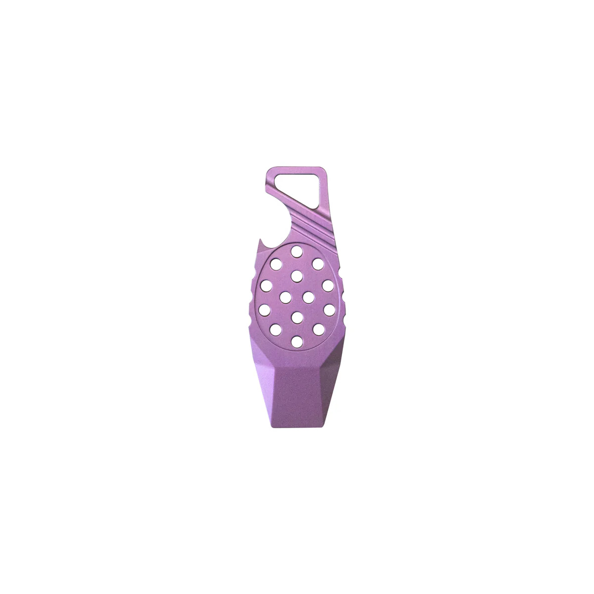 Budowa - tytanowa płytka, ścięta z jednej strony dla łatwiejszego podważania, zawierająca również otwieracz do butelek. Seria otworów w środkowej części polepsza wewność chwytu. Dzięki uchu w tylnej części z łatwością przypniemy nasz łom np. do kluczy. Całość w eleganckim wykończeniu Purple.