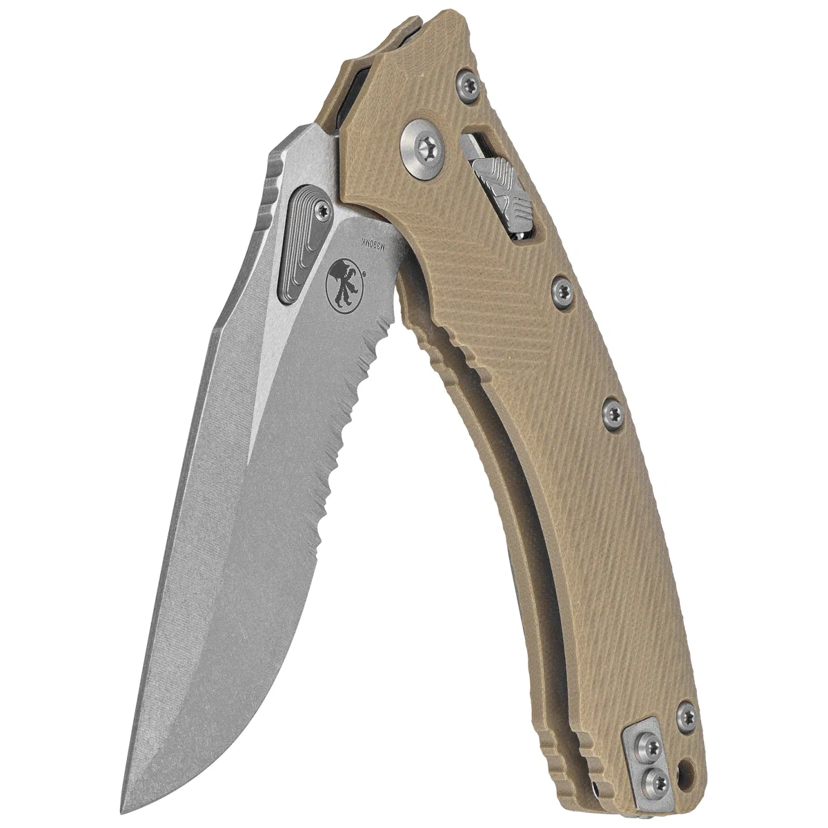 Rękojeść - wykonana z wytrzymałego kompozytu G10, dla lepszego uchwytu pokryta wyfrezowanymi liniami (Fluted). Szeroki suwak blokady z charakterystyczną dla firmy Microtech schodkową strukturą X. Obie okładziny zostały skręcone przy pomocy solidnego, backspacera. Dwustronny (prawa / lewa) tytanowy klips pozwala dyskretnie nosić nóż w pozycji tip-up. Nad klipsem lanyard hole, miejsce na linkę zabezpieczającą lub ozdobną.