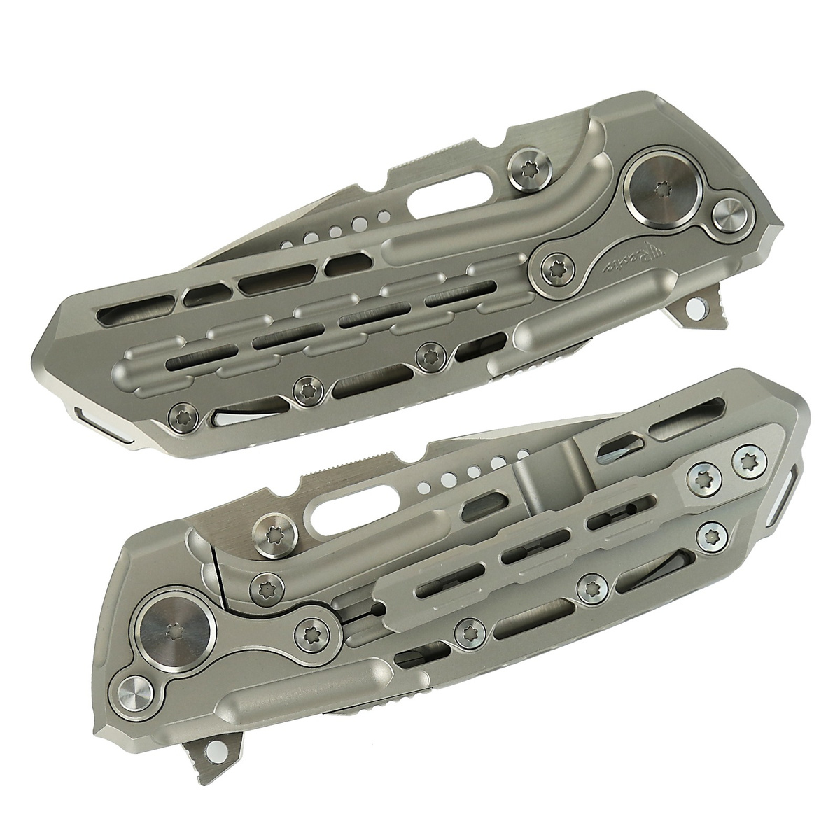 Rękojeść - z litego tytanu 6AL4V, perfekcyjnie wyfrezowana na obrabiarkach numerycznych CNC. Konturowanie okładek eliminuje ostre krawędzie, a ażurowana powierzchnia poprawia pewność chwytu. Tylko nieliczne firmy są w stanie wykonać rękojeść z tak nieprawdopodobną dokładnością! Okładziny połączono ze sobą przy pomocy tytanowego backspacera. Klips jednopozycyjny (prawa), z tytanu, umożliwia przenoszenie noża w pozycji tip-up. Na grzbiecie suwak zwalniania dodatkowej blokady w postaci dwóch stalowych walców umieszczonych nad osią pivota. Blokada działa również, gdy nóż jest zamknięty, zapobiegając przypadkowemu otwarciu. Wystający fragment backspacera może być używany jako improwizowany zbijak do szyb, posiada również otwór na linkę zabezpieczająca lub ozdobną.