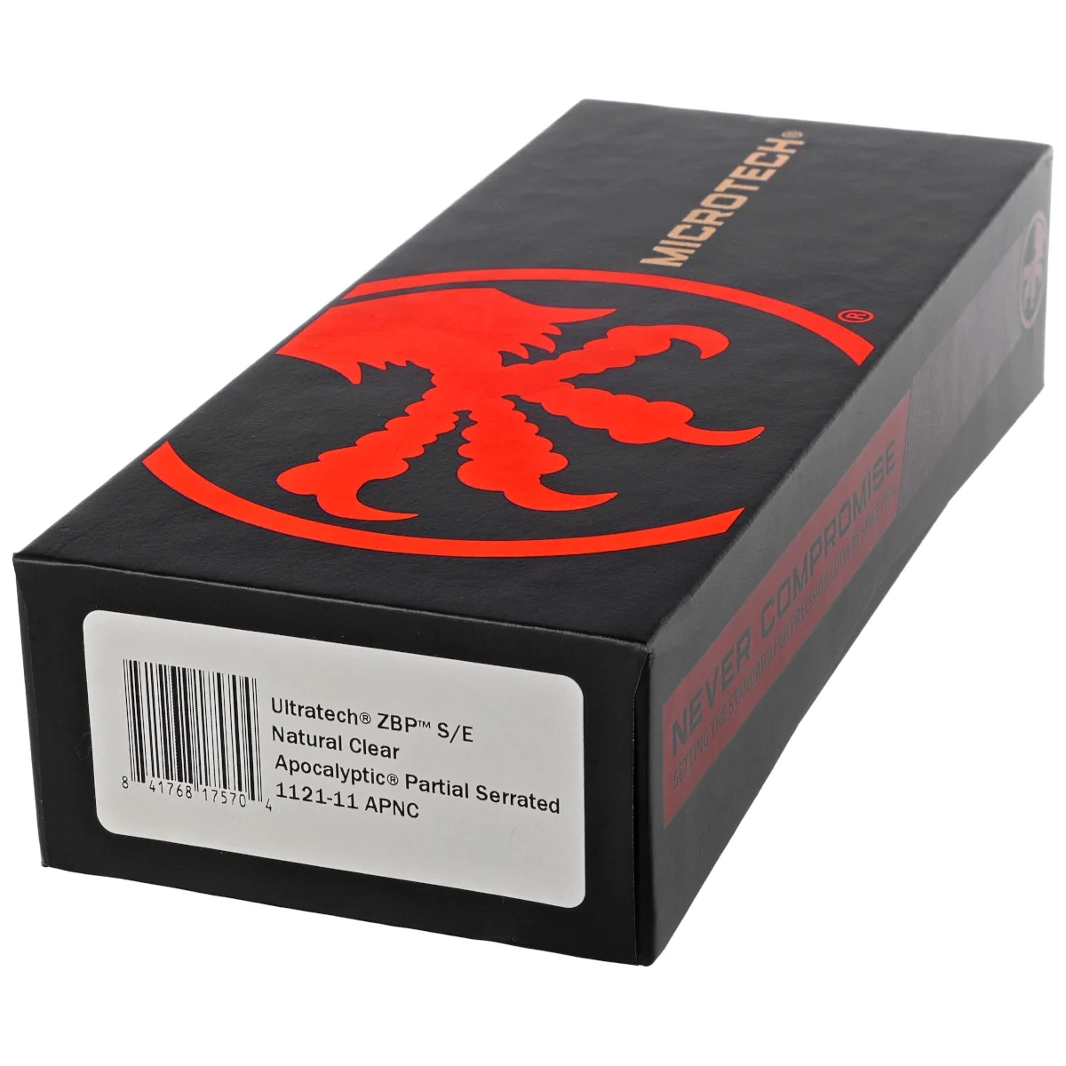 Ultratech Gen III ZBP S/E Natural Clear Aluminium, Apocalyptic P/S to nowa odsłona serii Ultratech - pierwszy nóż OTF firmy Microtech bez jakiegokolwiek luzu ostrza po jego rozłożeniu! Automat z ostrzem "blade play free" wyróżnia się szeregiem usprawnień, takich jak; Crud Kutter™, Dual-Fuel Drive Train™, Zero Blade Play™. Przeprojektowano również rękojeść, wyposażając ją w rozwiązania znane z innych modeli. Pracujący w trybie D/A (Double Action), umożliwia błyskawiczne wysunięcie i schowanie ostrza za pomocą jednego ruchu kciuka. Projekt autorstwa Tony’ego Marfione, właściciela Microtech Knives, łączy w sobie nowoczesny design z najwyższą jakością wykonania