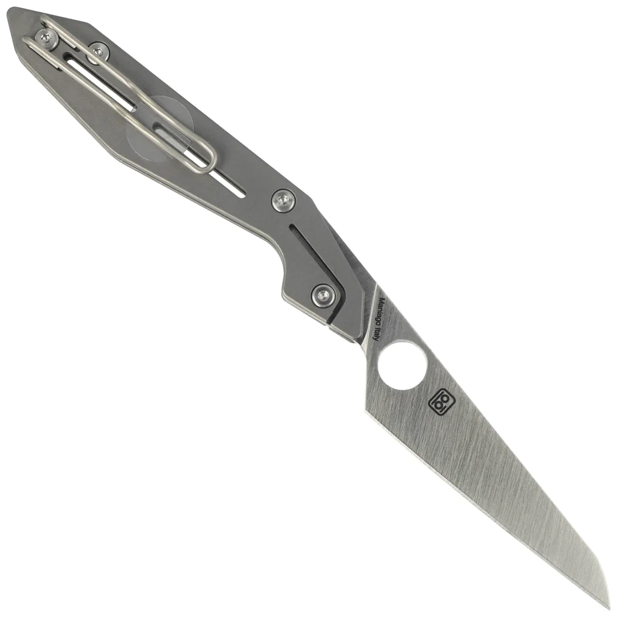 Rękojeść - z litego tytanu, co zapewnia wyjątkową sztywność przy niskiej masie i wysokiej odporności na korozję. Frezowane krawędzie, delikatne podpory pod palce oraz ergonomiczna linia uchwytu sprawiają, że nóż pewnie leży w dłoni mimo kompaktowych wymiarów. Choile oraz subtelne przetłoczenia poprawiają kontrolę i redukują ryzyko przypadkowego zamknięcia ostrza. Wbudowany mechanizm Ball Joint Non-Locking, oparty na podwójnym zatrzasku kulkowym, oferuje unikalne wrażenia z użytkowania – zachowując płynność pracy i spełniając wymogi prawne w krajach zakazujących noży z blokadą. Całość uzupełnia obustronny wire clip typu tip-up, który zapewnia dyskretne przenoszenie i łatwy dostęp. Otwarta konstrukcja nie tylko podkreśla techniczny charakter modelu, ale również ułatwia konserwację. To nóż EDC stworzony z myślą o użytkownikach ceniących inżynieryjne podejście, estetykę i subtelną funkcjonalność.