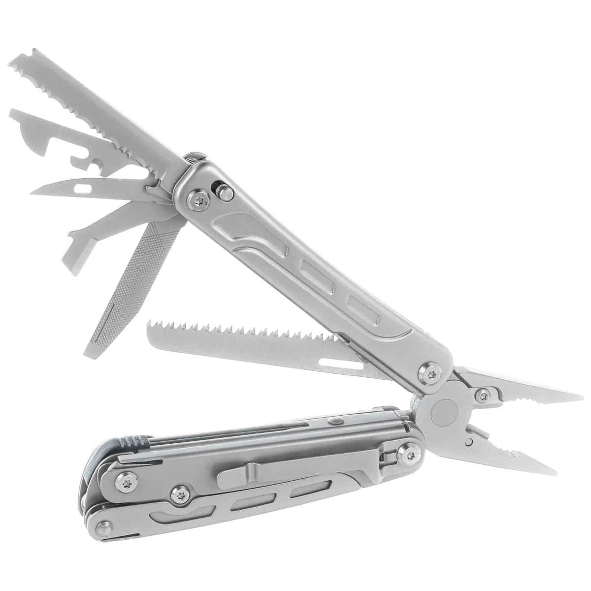 Rękojeść - wykonana została z satynowanej stali nierdzewnej AISI 440, co gwarantuje odporność na wilgoć, zarysowania i zużycie mechaniczne. Konstrukcja skeleton z frezowanymi otworami redukuje masę i zwiększa sztywność, zapewniając wygodę użytkowania nawet podczas długiej pracy. Ergonomiczne zaokrąglenia poprawiają komfort operowania narzędziami, a tekstura chwytu wspiera kontrolę nad narzędziem w każdych warunkach. Model wyposażono w klips typu deep carry do niskoprofilowego przenoszenia oraz otwór na linkę umożliwiający dodatkowe zabezpieczenie. Długość uchwytów została zoptymalizowana do pracy z piłą i kombinerkami, oferując stabilność i precyzję. To kompleksowe, solidne narzędzie dla wymagających użytkowników ceniących uniwersalność, trwałość i praktyczność w jednym kompaktowym multitoolu.