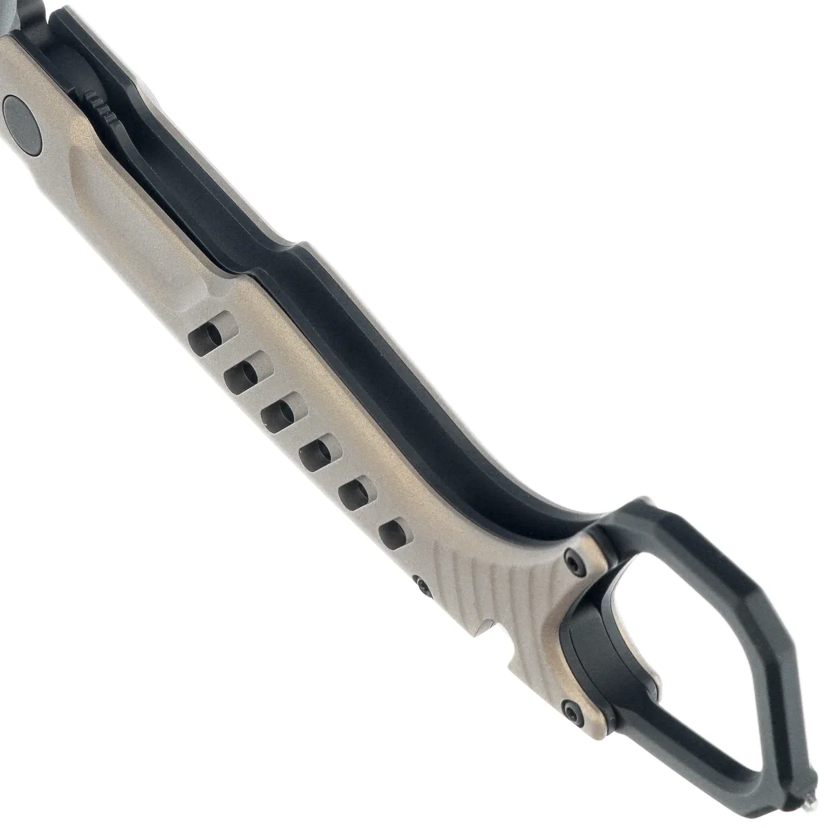 MH-STEALTH Desert Aluminium, Black to zaawansowany nóż taktyczny EDC zaprojektowany przez Extrema Ratio we współpracy z jednostkami specjalnymi KSK (Kommando Spezialkräfte). Stanowi odpowiedź na potrzeby operacyjne, oferując natychmiastowy dostęp do ostrza, wysoki poziom ergonomii oraz funkcjonalność w warunkach terenowych i ratunkowych. Głownia wykonana ze stali Böhler N690 charakteryzuje się doskonałą odpornością na korozję i ścieranie. Częściowo ząbkowana krawędź tnąca pozwala szybko przecinać miękkie włókna czy pasy, a otwór w klindze umożliwia szybkie otwieranie jedną ręką – nawet w rękawicach. Konstrukcję uzupełnia ostrze do cięcia pasów, dyskretnie umieszczone na grzbiecie noża, wspierające ewakuację z pojazdów. Rękojeść z anodowanego aluminium została zaprojektowana z myślą o pewnym chwycie – także w błocie, deszczu i ograniczonej widoczności. Zintegrowany finger ring pozwala na operowanie nożem w różnych chwytach, a zbijak ratowniczy umieszczony w tylnej części zwiększa jego użyteczność w sytuacjach awaryjnych. Całość uzupełnia otwarta konstrukcja typu open-back, duże śruby ułatwiające demontaż, oraz kabura kompatybilna z systemem M.O.L.L.E., umożliwiająca montaż poziomy, pionowy lub na oporządzeniu. MH-STEALTH to profesjonalne narzędzie, zaprojektowane bez kompromisów – gotowe na każde zadanie.