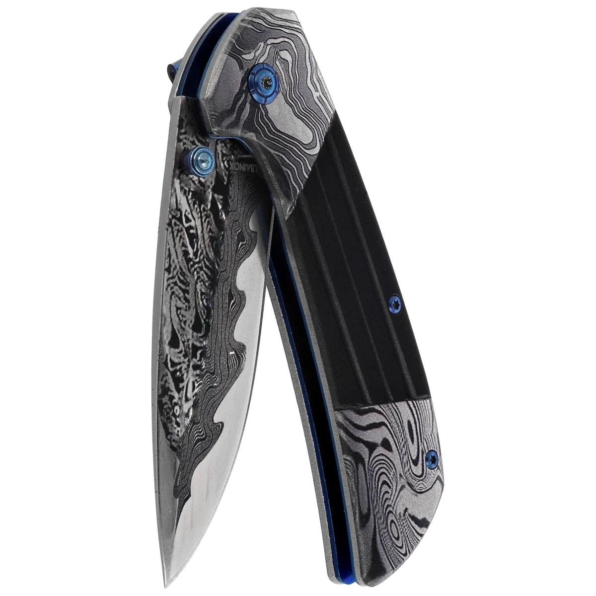 Rękojeść - wykonana z stalowych okładzin, ozdobionych identycznym jak na ostrzu wzorem 3D. Taka konstrukcja zapewnia wysoką odporność na uszkodzenia mechaniczne i wilgoć, a jej symetryczny, minimalistyczny wygląd doskonale komponuje się z głownią. Mimo gładkiej powierzchni, odpowiednie wyważenie i długość rękojeści zapewniają dobrą kontrolę chwytu. Klips do przenoszenia, zamontowany po jednej stronie, pozwala na łatwe i dyskretne noszenie noża w kieszeni. Rękojeść tego modelu to propozycja dla osób ceniących monolityczne, solidne konstrukcje z wyrazistym detalem – trwałe, praktyczne i estetyczne w codziennym użytkowaniu.