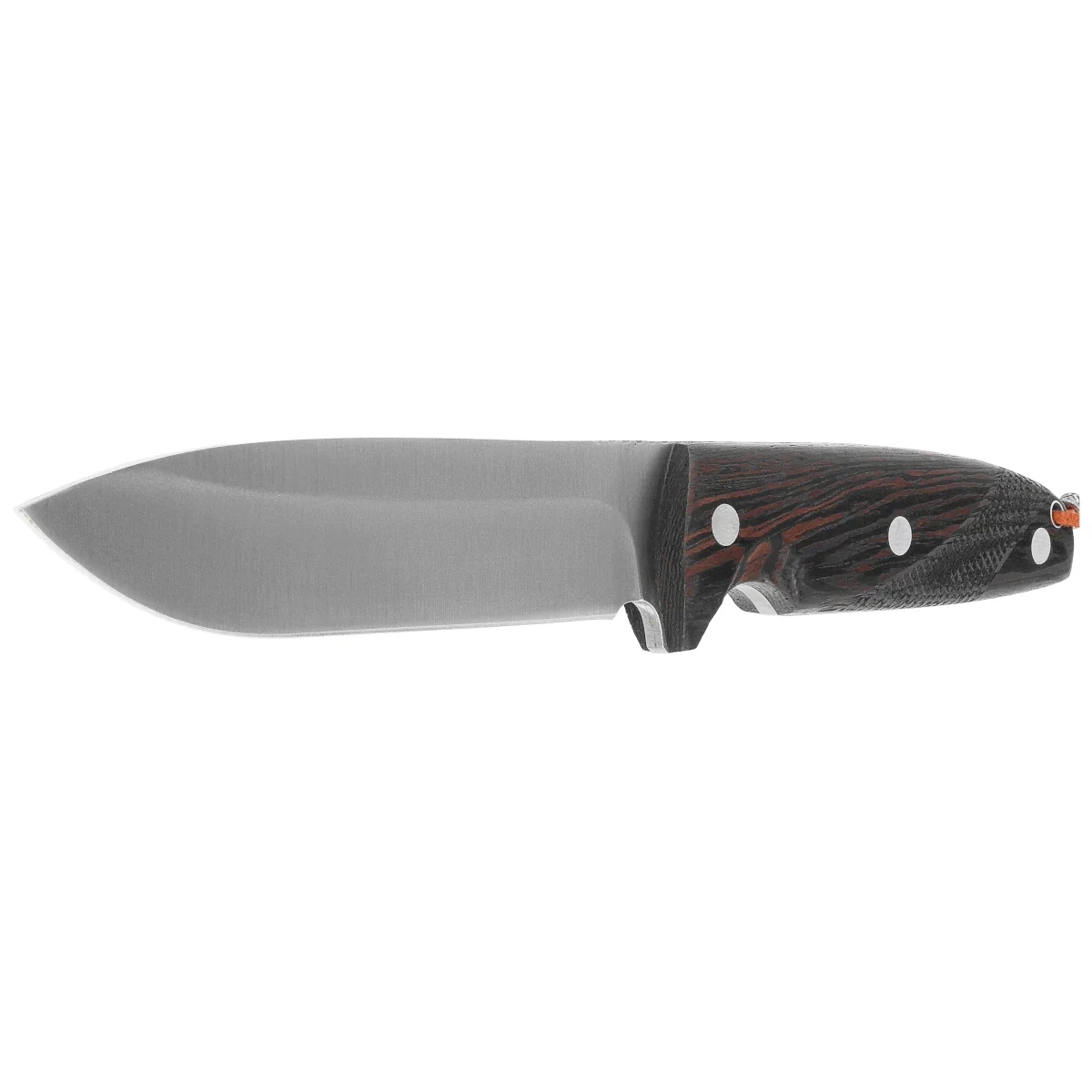 Rękojeść - wykonana została z naturalnego drewna wengé, charakteryzującego się ciemnym, estetycznym usłojeniem oraz wysoką odpornością na wilgoć i zużycie. Ergonomiczna forma z delikatnym profilowaniem wspiera stabilny chwyt i kontrolę nad narzędziem, również w warunkach terenowych. Okładziny osadzono na pełnym trzpieniu głowni, co zwiększa sztywność i trwałość konstrukcji. W zestawie znajduje się pochwa ze skóry, umożliwiająca przenoszenie noża przy pasie i zapewniająca szybki dostęp do narzędzia w terenie. To rękojeść zaprojektowana z myślą o komforcie, estetyce i pewności działania – zgodna z ideą klasycznych, trwałych noży outdoorowych.