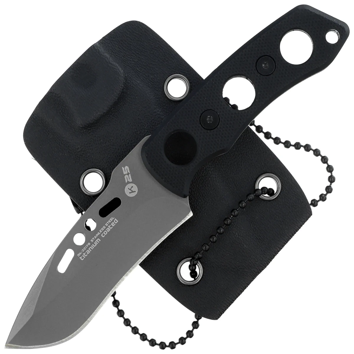 - RK-32178 Neck Knife Black G10, Titanium – kompaktowy nóż na szyję typu neck knife z ostrzem ze stali 7Cr17MoV pokrytym powłoką titanium, ergonomiczną rękojeścią z G10 i pochwą z Kydexu. Wyważony wybór do EDC i zastosowań taktycznych.