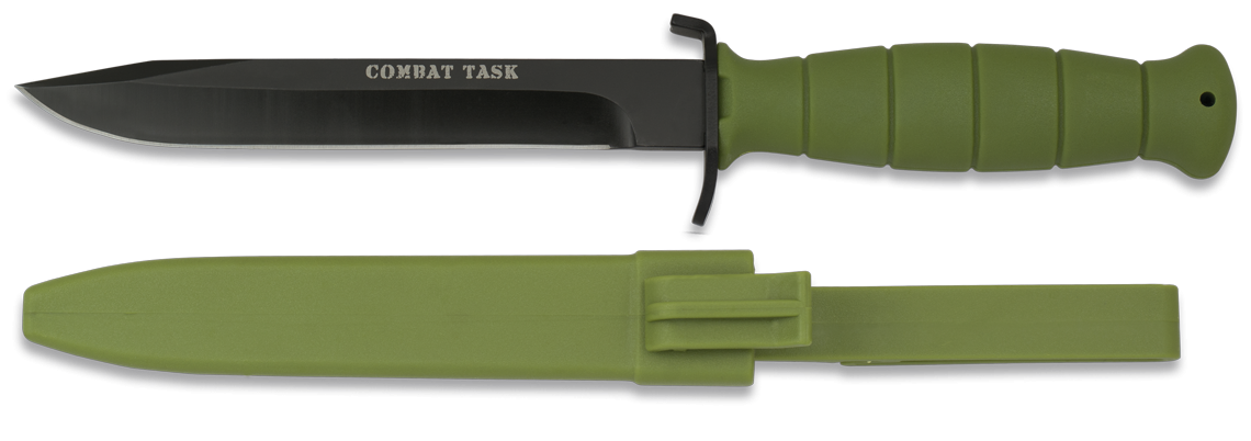- Combat Task Olive ABS, Black 3Cr13MoV – taktyczny nóż inspirowany Glockiem. Głownia typu clip point pokryta czarną powłoką, rękojeść z teksturowanego ABS-u. W zestawie pochwa z tworzywa na pas lub do oporządzenia.