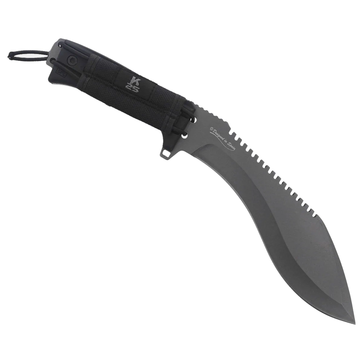 Głownia - profil kukri umożliwia zwiększenie siły cięcia przy zachowaniu dobrej kontroli nad ostrzem, co sprawia, że narzędzie doskonale nadaje się do rąbania gałęzi, przecinania gęstej roślinności oraz innych zadań terenowych. Ostrze zostało wykonane ze stali nierdzewnej 7Cr17MoV, odpornej na korozję i łatwej w konserwacji. Powłoka titanium zabezpiecza głownię przed zarysowaniami i wpływem wilgoci, a jej matowa struktura redukuje odbicia światła. Zastosowany szlif płaski pozwala na efektywne wnikanie ostrza w materiał, zachowując przy tym odpowiednią grubość dla zapewnienia trwałości. Konstrukcja typu full tang dodatkowo usztywnia całość, zwiększając bezpieczeństwo i niezawodność w czasie intensywnego użytkowania.