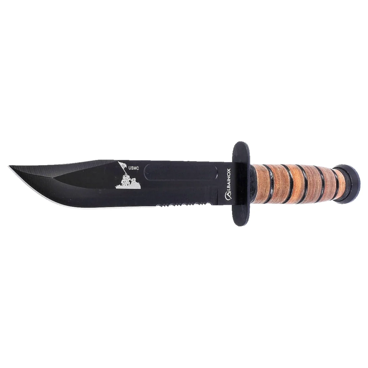 - USMC wzór Ka-Bar Brown Leather, Black 3Cr13MoV – klasyczny nóż taktyczny o konstrukcji full tang, z głownią typu clip point pokrytą czarną powłoką i rękojeścią ze sprasowanej skóry ekologicznej. W zestawie pochwa skórzana do pasa.