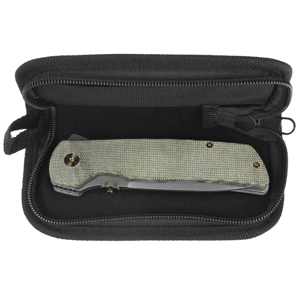 Rękojeść - z wysokowytrzymałego kompozytu Canvas Micarta w odcieniu OD Green, materiału odpornego na działanie wilgoci, zabrudzenia oraz uszkodzenia mechaniczne. Delikatne fazowanie krawędzi i anatomiczne profilowanie uchwytu zapewniają naturalne ułożenie dłoni, zwiększając stabilność i kontrolę operowania nożem przy dłuższej pracy. Struktura materiału zachowuje przyczepność nawet w trudnych warunkach, zapewniając pewny chwyt również w rękawicach lub przy zwiększonej wilgotności.