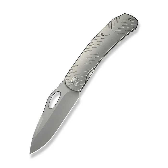 Rękojeść - powstała z frezowanego tytanu 6Al-4V, gwarantującego wysoką odporność mechaniczną, sztywność konstrukcji oraz pełną odporność na korozję przy zachowaniu niskiej masy całkowitej. Subtelne raindrop milling poprawia chwytność, podnosząc ergonomię oraz estetykę rękojeści. Wyprofilowanie bocznych krawędzi oraz zaokrąglone linie wspierają naturalne ułożenie dłoni, minimalizując zmęczenie przy dłuższej pracy. Konstrukcję uzupełnia precyzyjnie dopasowany backspacer oraz tytanowy klips deep-carry tip-up, umożliwiający dyskretne przenoszenie noża w kieszeni. Dodatkowe miejsce na linkę zabezpieczającą zwiększa funkcjonalność podczas pracy w terenie. Całość utrzymana jest w stonowanej stylistyce użytkowego minimalizmu klasy premium.