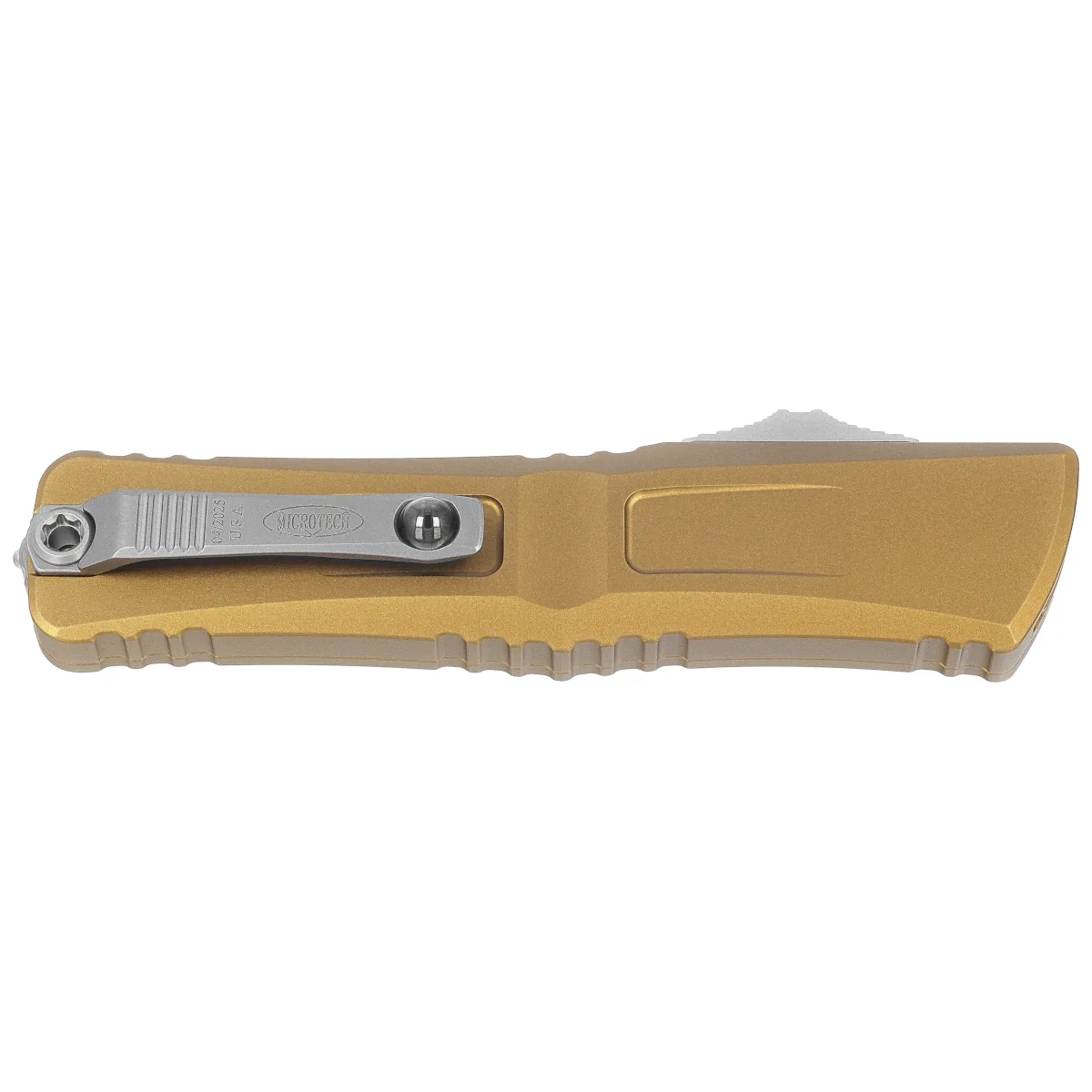 Rękojeść - wykonana z doskonałą precyzją w technologii 3D na frezarkach CNC, z pokrytego powłoką Mil-Spec aluminium 6061-T6. Faktura powierzchni rękojeści oraz głębokie nacięcia (jimping) na niej sprawiają, że nóż nie ślizga się w dłoni podczas używania. Smukły profil oraz frezowany dwupozycyjny (prawa/lewa) masywny klips typu deep carry, umożliwiają dyskretne przenoszenie noża w kieszeni, w pozycji tip-down (czubkiem ostrza do dołu). Wyposażony w gładką kulkę rollerball, dzięki której nóż z łatwością wsuwa się do kieszeni nie niszcząc brzegów kieszeni. Na klipsie znajduje się logo Microtech i data produkcji. Rękojeść zakończono zbijakiem do bicia szyb, stalowy trójkąt, w który wprasowano kulkę z węglika wolframu.