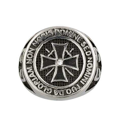 - Pierścień Tole 10 Imperial Templar Cross Ring Ø21 (09980-21) – stylizowany sygnet z emblematem krzyża templariuszy i dewizą „Non nobis Domine, sed nomini tuo da gloriam”, wykonany z polerowanego metalu. Idealny dodatek dla miłośników symboliki rycerskiej.