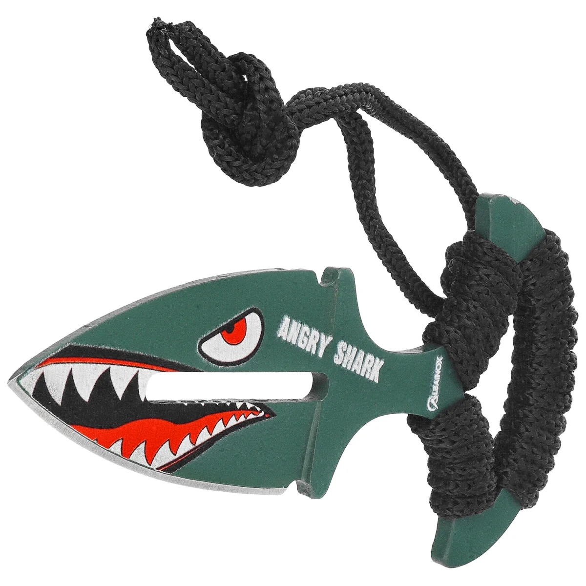 Głownia – ostrze typu skinner wykonano z wysokiej jakości stali nierdzewnej 3Cr13MoV, zapewniającej odporność na korozję i łatwe ostrzenie. Długość ostrza to 6,5 cm (65.0 mm / 2.56"), a grubość 3,8 mm – co zapewnia odpowiednią sztywność i kontrolę przy cięciu. Ostrze pozbawione ząbkowania, wykończone jest w efektownym kolorze zielonym z trójwymiarową grafiką motywu rekina (angry shark).