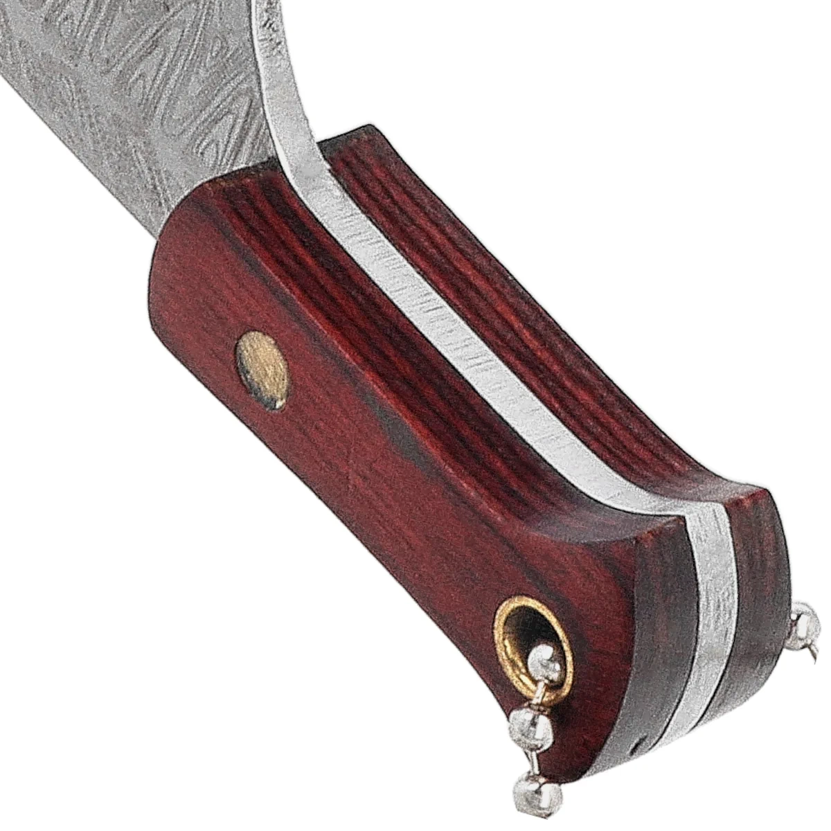Model 32767 od Martinez Albainox to kompaktowy nóż brelokowy zaprojektowany z myślą o użytkownikach poszukujących stylowego i praktycznego dodatku do codziennego wyposażenia EDC. Mimo niewielkich rozmiarów oferuje pełną funkcjonalność niezbędną przy drobnych zadaniach – od przecinania linek po otwieranie paczek. To rozwiązanie, które łączy estetykę z użytkowością w skondensowanej formie. Głownia z nierdzewnej stali 3Cr13Mov pokryta została dekoracyjnym wzorem imitującym Damascus, co nadaje jej szlachetnego charakteru bez wpływu na parametry użytkowe. Wzór ten wzbogaca ostrze wizualnie, podkreślając jego kolekcjonerski potencjał i odwołując się do klasycznych technik zdobienia klingi. Rękojeść z naturalnego drewna cechuje się prostą, ergonomiczną formą, która zapewnia komfort chwytu nawet przy ograniczonej długości noża. Mosiężny pin i precyzyjne wykończenie nadają całości klasyczny wygląd. Do zestawu dołączono skórzany futerał z zatrzaskiem oraz łańcuszek kulkowy, dzięki któremu nóż może być wygodnie przypięty do kluczy, torby czy wyposażenia outdoorowego. Ten miniaturowy folder to praktyczna ozdoba i podręczne narzędzie w jednym – dla miłośników detali, klasyki i codziennej funkcjonalności.