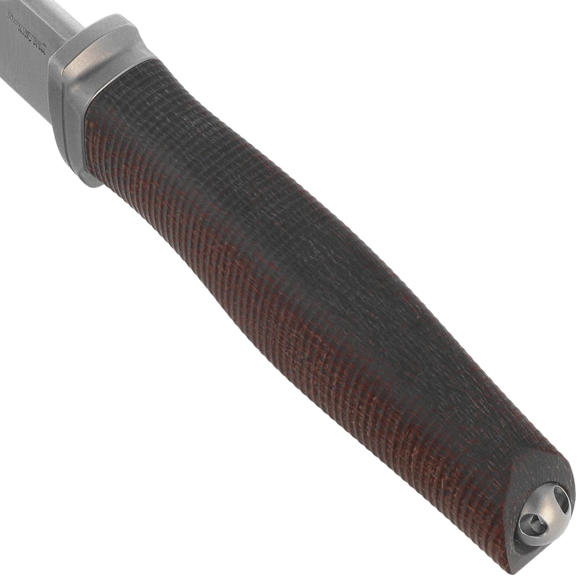 Rękojeść - wykonano z Burlap Micarty, czyli warstw włókien jutowych zatopionych w żywicy epoksydowej. Dzięki swojej strukturze materiał ten oferuje wyjątkową odporność na wilgoć, ścieranie i zmienne temperatury, pozostając jednocześnie lekki i komfortowy w użytkowaniu. Chropowata powierzchnia zapewnia dobrą przyczepność także w rękawicach lub przy mokrej dłoni. Profilowanie uchwytu zostało zaprojektowane z myślą o maksymalnej ergonomii – zaokrąglone krawędzie i delikatne podcięcia pod palce poprawiają komfort długotrwałej pracy. Całość zamknięta jest stalową nakrętką serwisową w tylnej części rękojeści, umożliwiającą łatwy demontaż rękojeści do czyszczenia. Konstrukcja hidden tang, w połączeniu z tytanowym jelcem, gwarantuje sztywność, odporność na przeciążenia i wysoką niezawodność nawet przy intensywnym użytkowaniu. Rękojeść Acha to doskonale wyważone połączenie nowoczesnych materiałów i klasycznej formy użytkowej.