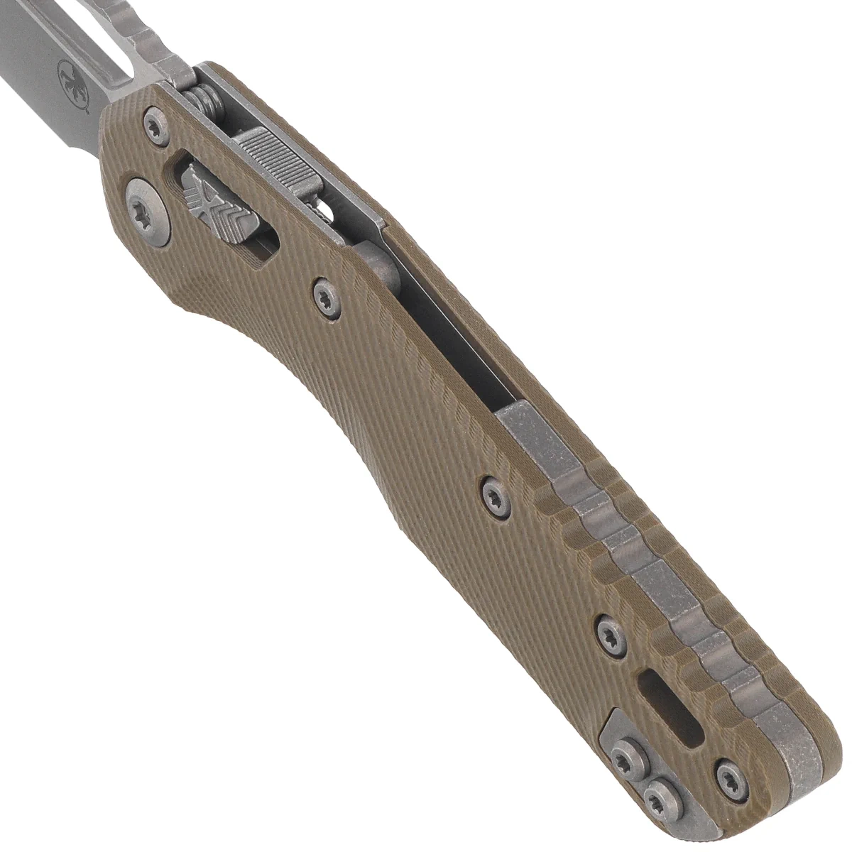 Rękojeść - wykonana z najwyższą precyzją na frezarkach CNC z kompozytu G10. Dla poprawy chwytu powierzchnię rękojeści pokryto głęboko frezowaną, strukturą 3D Fluted, która zapewnia pewny i stabilny chwyt. Szeroki suwak blokady z charakterystyczną dla Microtechu schodkową fakturą (X Button) gwarantuje pewną i komfortową obsługę. Okładziny połączono solidnym, aluminiowym backspacerem. Dwustronny (prawa/lewa) klips umożliwia dyskretne przenoszenie noża w pozycji tip-up. Nad klipsem znajduje się lanyard hole, czyli otwór na linkę zabezpieczającą lub ozdobną.