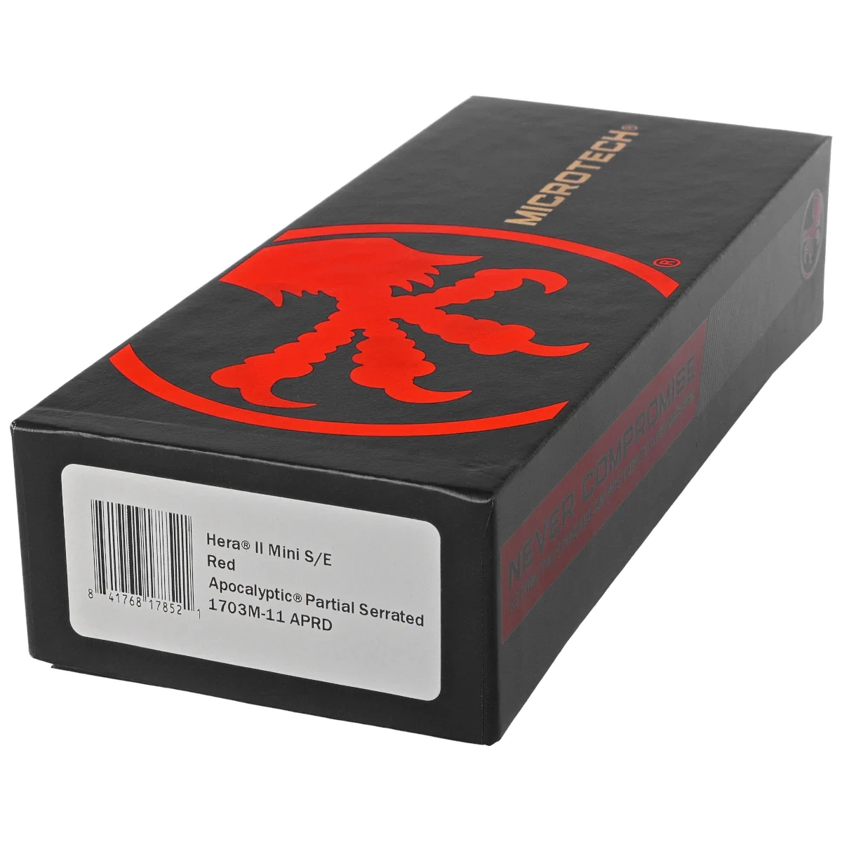 Hera 2 Mini S/E Red Aluminium, Apocalyptic P/S  kompaktowa wersja jednego z najlepszych i wszechstronnych noży automatycznych OTF (Out The Front). Wzorowany na kultowym automacie Troodon, stanowi pośrednie ogniwo pomiędzy modelami EDC a taktycznymi. Automat o ponadprzeciętnej wytrzymałości pracuje w trybie D/A (Double Action) wykorzystując działający z ogromną siłą i mocą, mechanizm otwierający. Ten model charakteryzuje się doskonałym dopasowaniem i wspaniałym wykończeniem. Projekt Anthony'ego Marfione knifemakera i właściciela Microtech Knives.